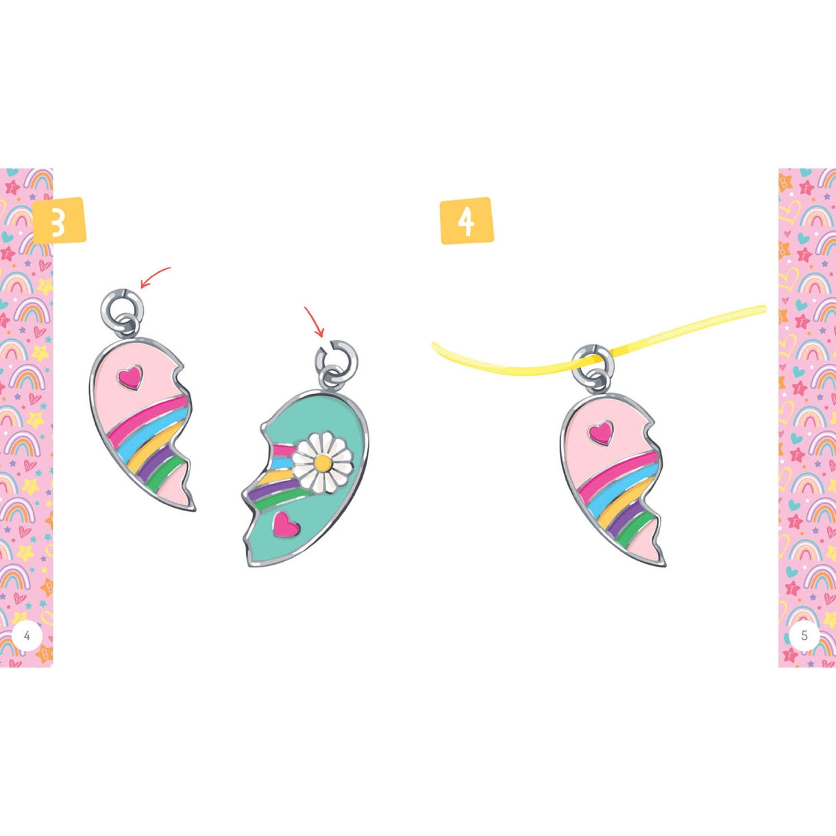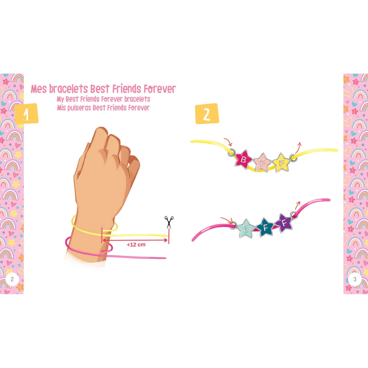 Æsken indeholder en trin-for-trin vejledning og alt det materiale, du skal bruge til at lave dine armbånd: fire charms, to »BFF'er« (Best Friends Forever) og to hjerter, der passer sammen, samt to snore i flotte farver.