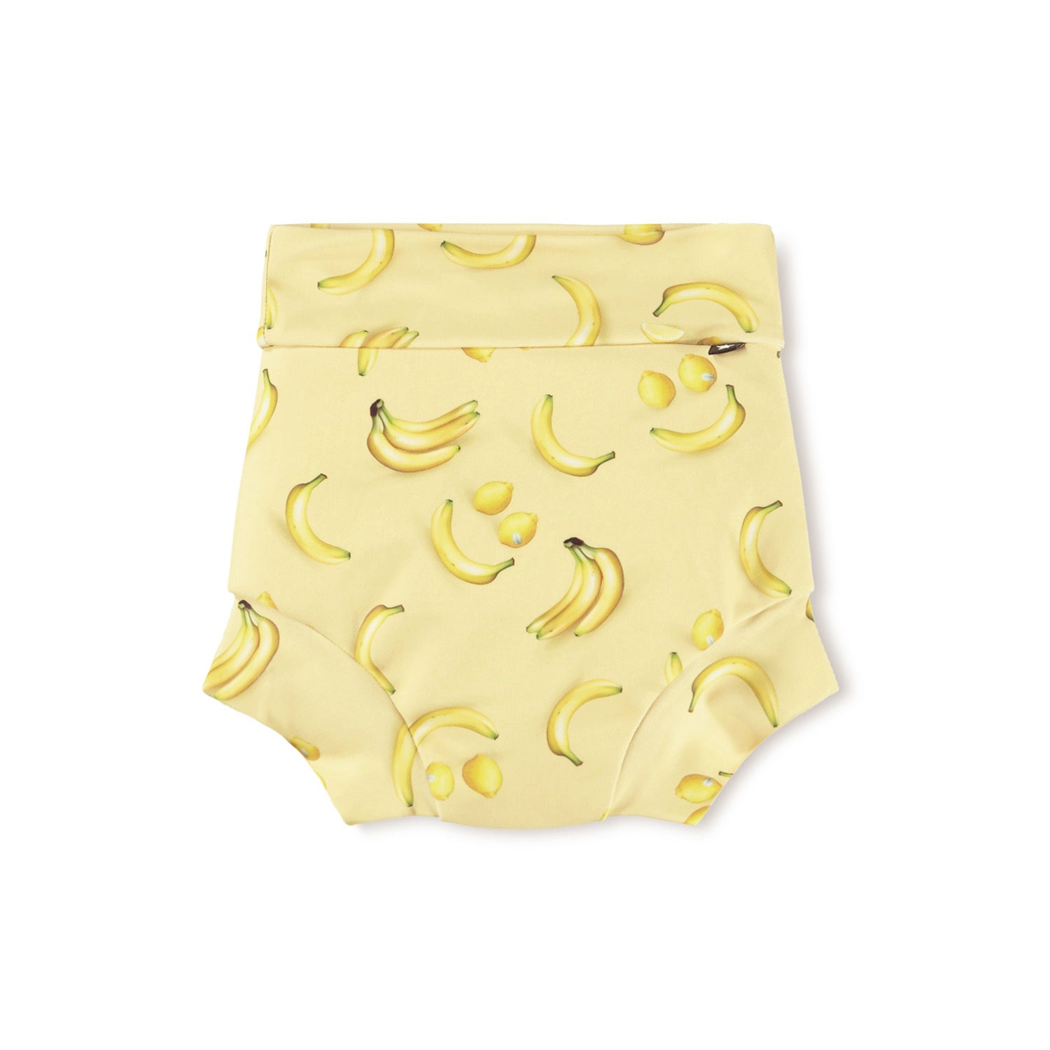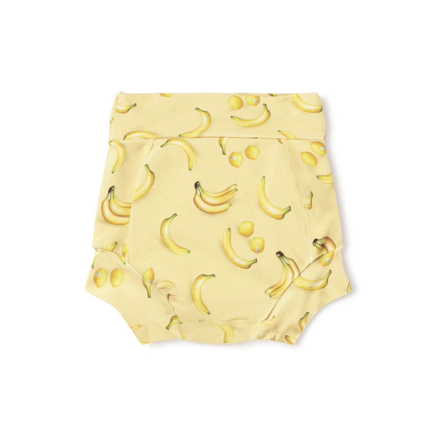 Lækagefri badebukser i genanvendt polyester med UV-beskyttelse 50+. Badebukserne er helforede og har en tætsiddende pasform, der slutter tæt om lår og mave, hvilket gør, at de kan bæres uden badeble. De er lysegule med glade bananer og citroner.