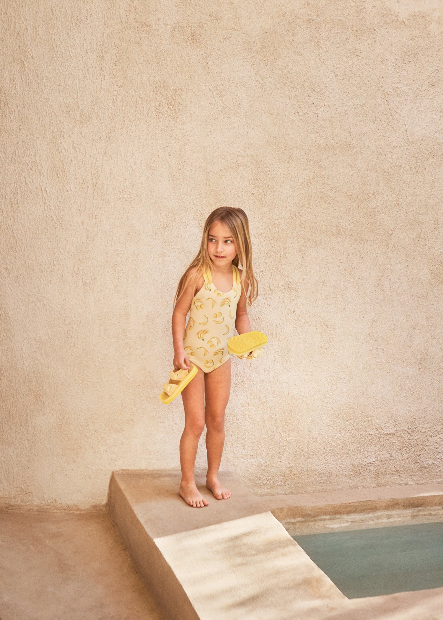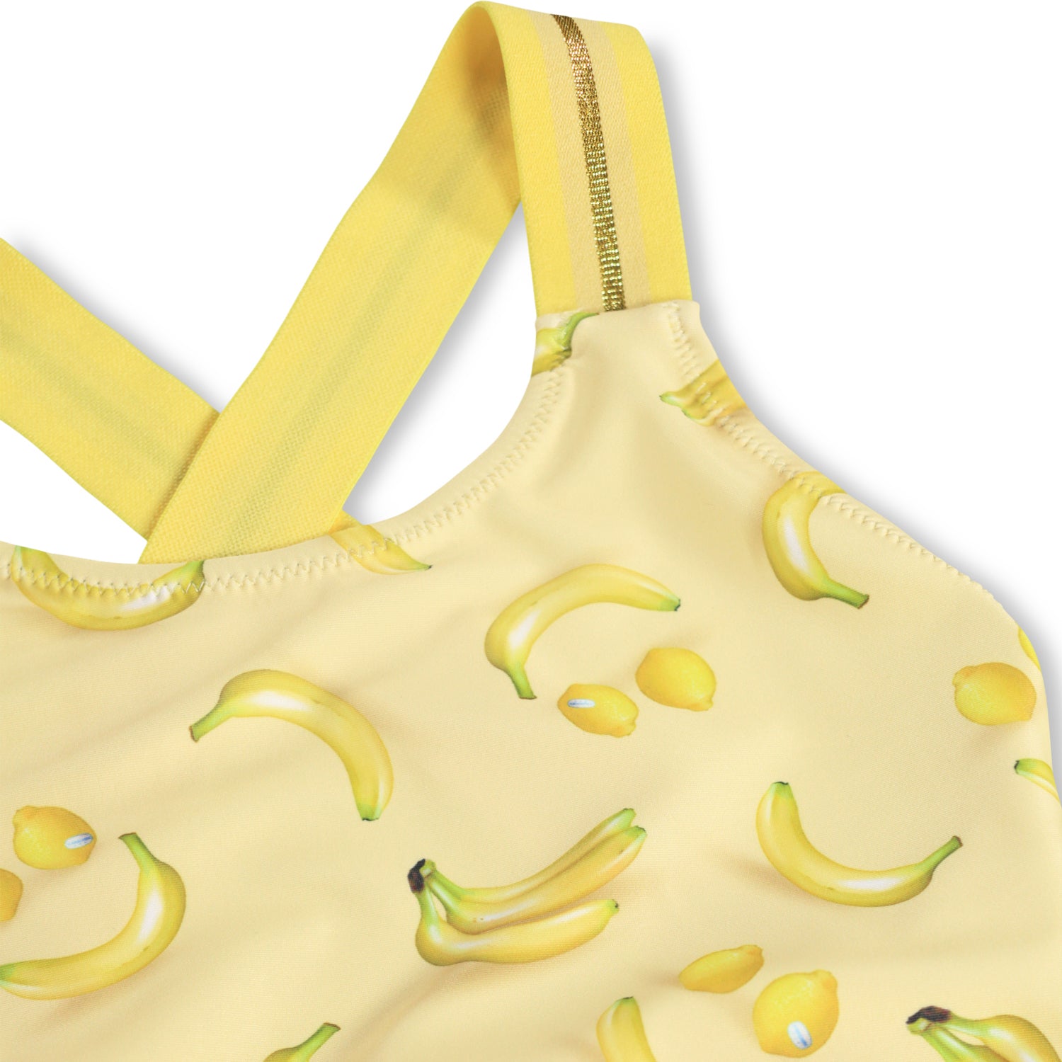 Badedragt i pastel gul med bananer og citroner. Badedragten har rund halsudskæring og brede stribede elastikstropper i gul og guld, som krydser ved ryggens bløde v-udskæring. Det elastiske materiale gør den yderst behagelig og nem at få af og på. Den tilbyder høj UV-beskyttelse på 50+, der effektivt beskytter mod solens stråler. Produktet er CE-mærket og testet i henhold til standard: EN-13758-1...