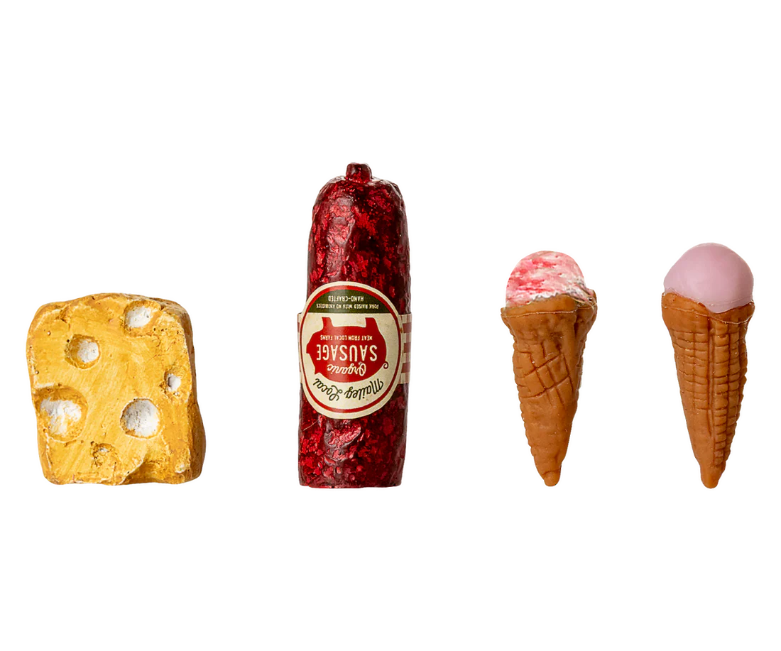 Et gammeldags køleskab i metal. Inde i køleskabet finder du en lille ost, pølse og nogle is. Disse vil forlænge historiefortællingen og legen.