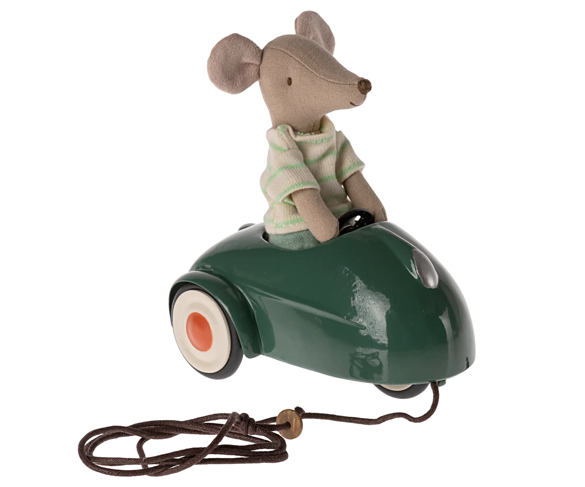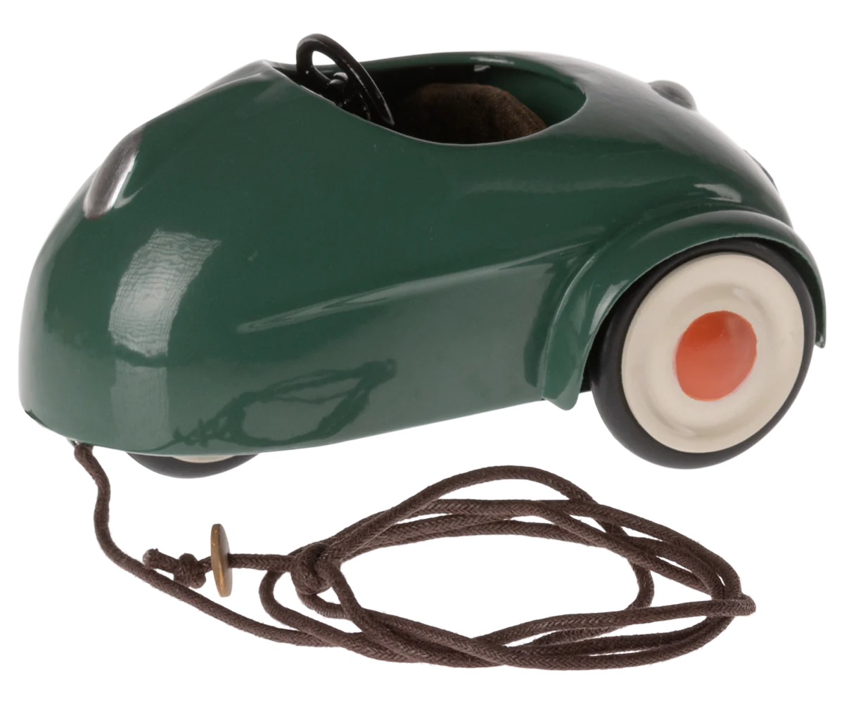 Metalbilen er perfekt transportmiddel til musene. Bilen passer til mus i størrelserne lillebror/søster, storebror/søster og mor/far. Den medfølgende snor kan bindes fast under bilen, så barnet kan trække bilen.
