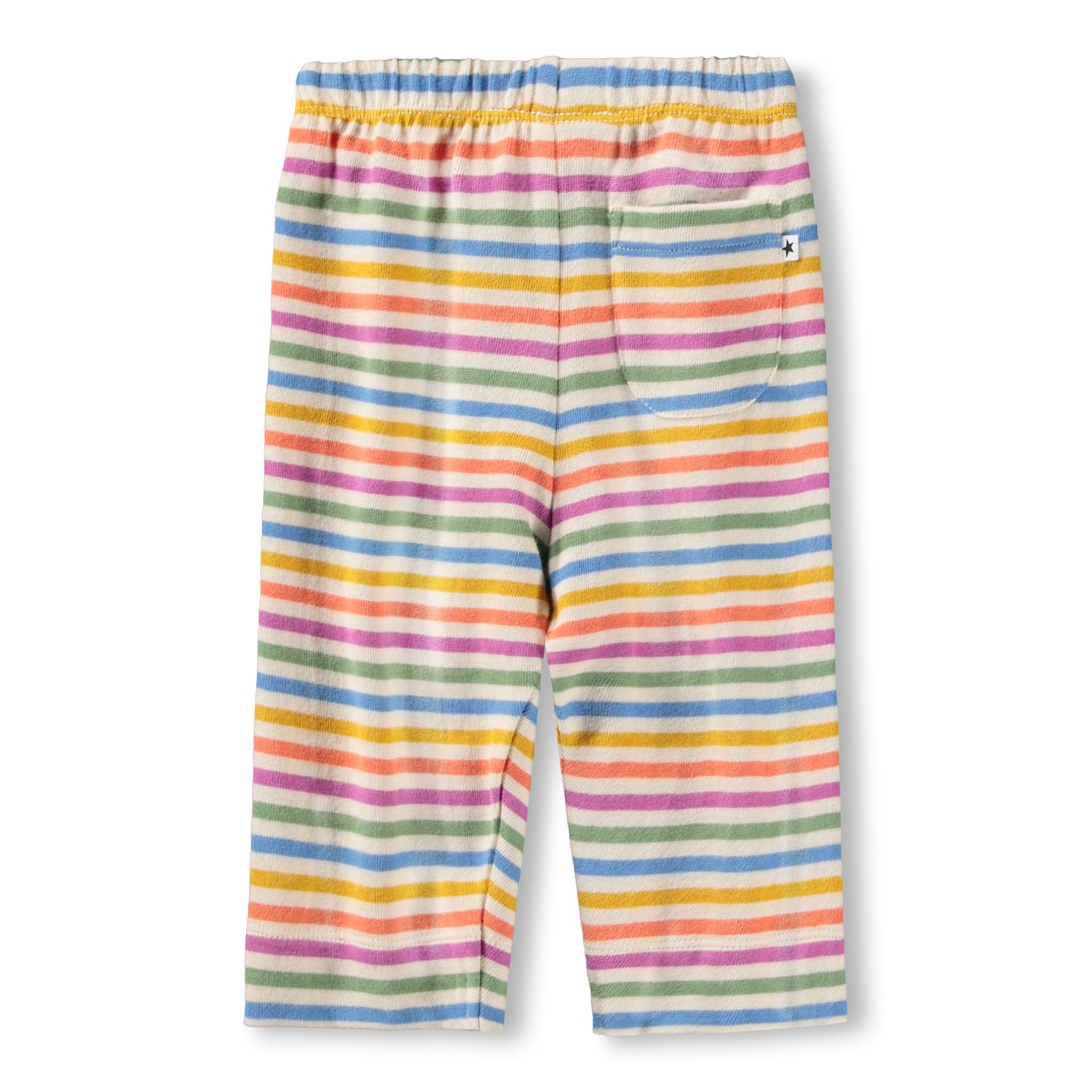 Multifarvet stribet bukser i regnbuens farver til de mindste, fremstillet i økologisk bomuld. Bukserne har en løs pasform med en baglomme samt en elastik og snøre i taljen, der gør dem nemme at tage af og på. Det lette og luftige design sikrer masser af bevægelsesfrihed, og ved lommen finder du et lille broderet smilende ansigt. Kombiner bukserne med en matchende bluse for et komplet sæt.