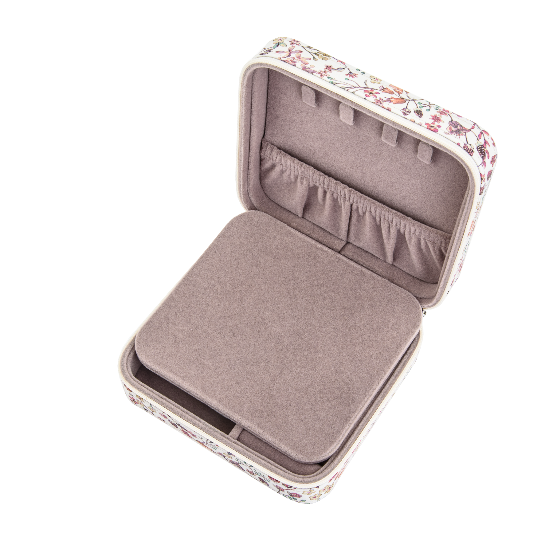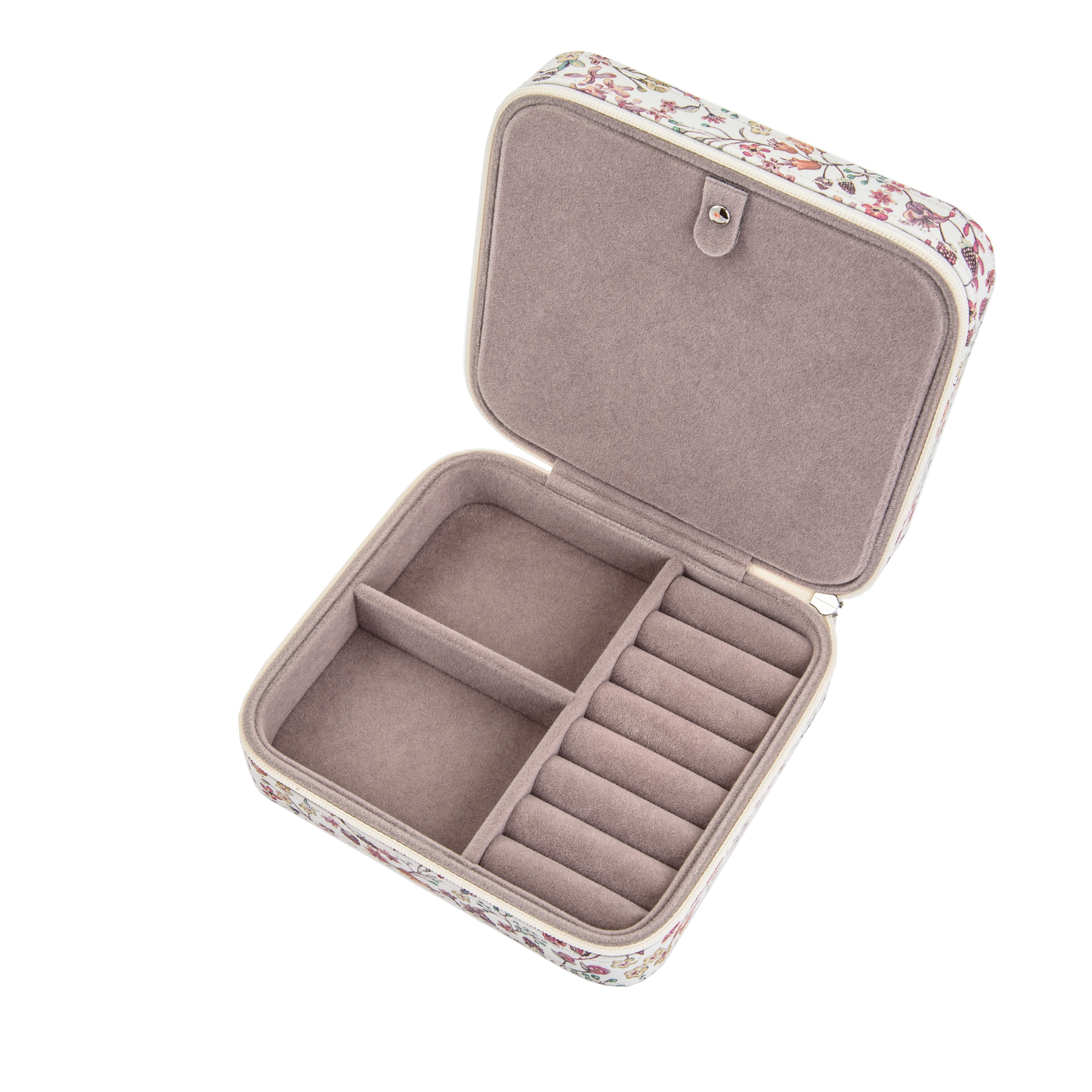 Lækkert firkantet smykkeskrin beklædt med smukt Donna Leigh organic Liberty stof. En feminin og sød smykkeboks, som også er særdeles velegnet til at have med i kufferten. Smykkeæsken er indrettet med plads til smykker i to lag. Det nederste lag byder på forskellige rum til ringe, øreringe og små smykker, mens det øverst lag rummer en flad skuffe med elastisk lomme og kroge i låget – perfekt til halskæder og armbånd. Indersiden af smykkeskrinet er polstret med velour, og selve smykkeskrinet lukkes med en smart lynlås, der gør det nemt at have med på farten.