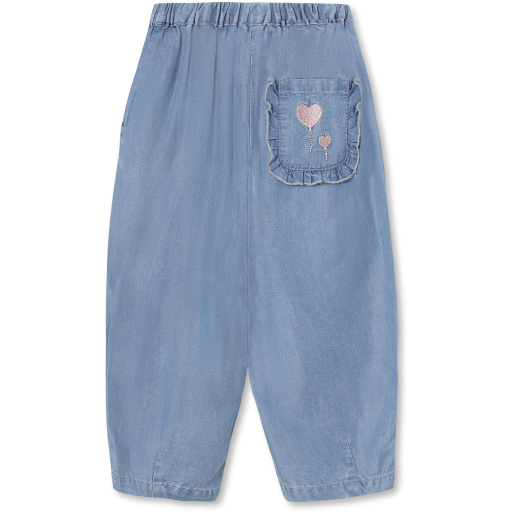 Bløde bukser med løs pasform. Bukserne har skrå lommer foran med flæser. Bagpå har den en enkelt lomme med flæser langs kanten og et broderi med en hjerteballon.