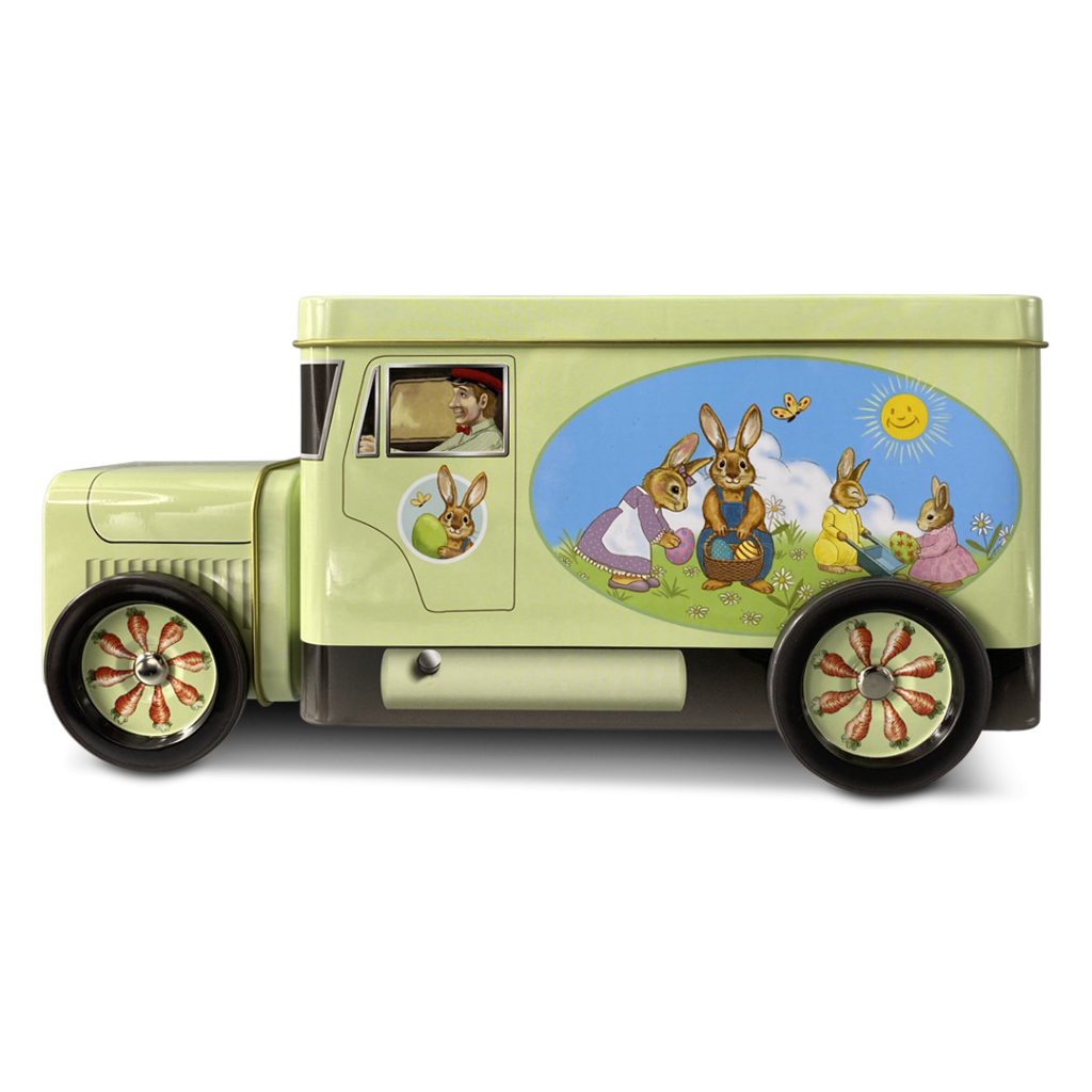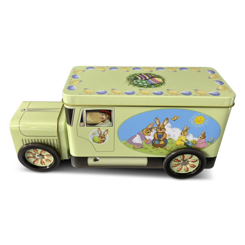 Rigtig sød påske kagedåse som en lastbil. Lastbilen er gul med fine påskemotiver som søde kaniner, æg og søde gulerødder på hjulene.