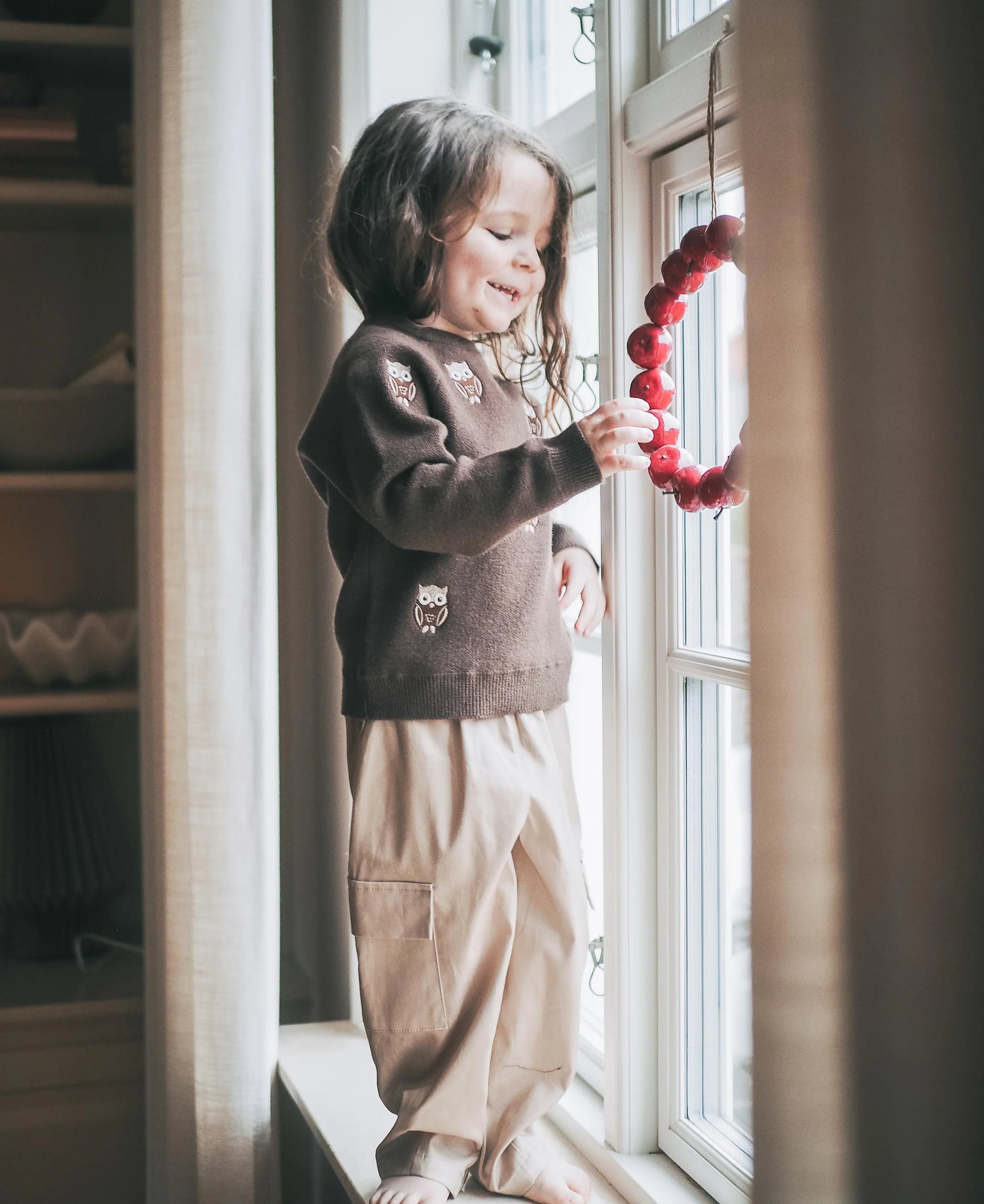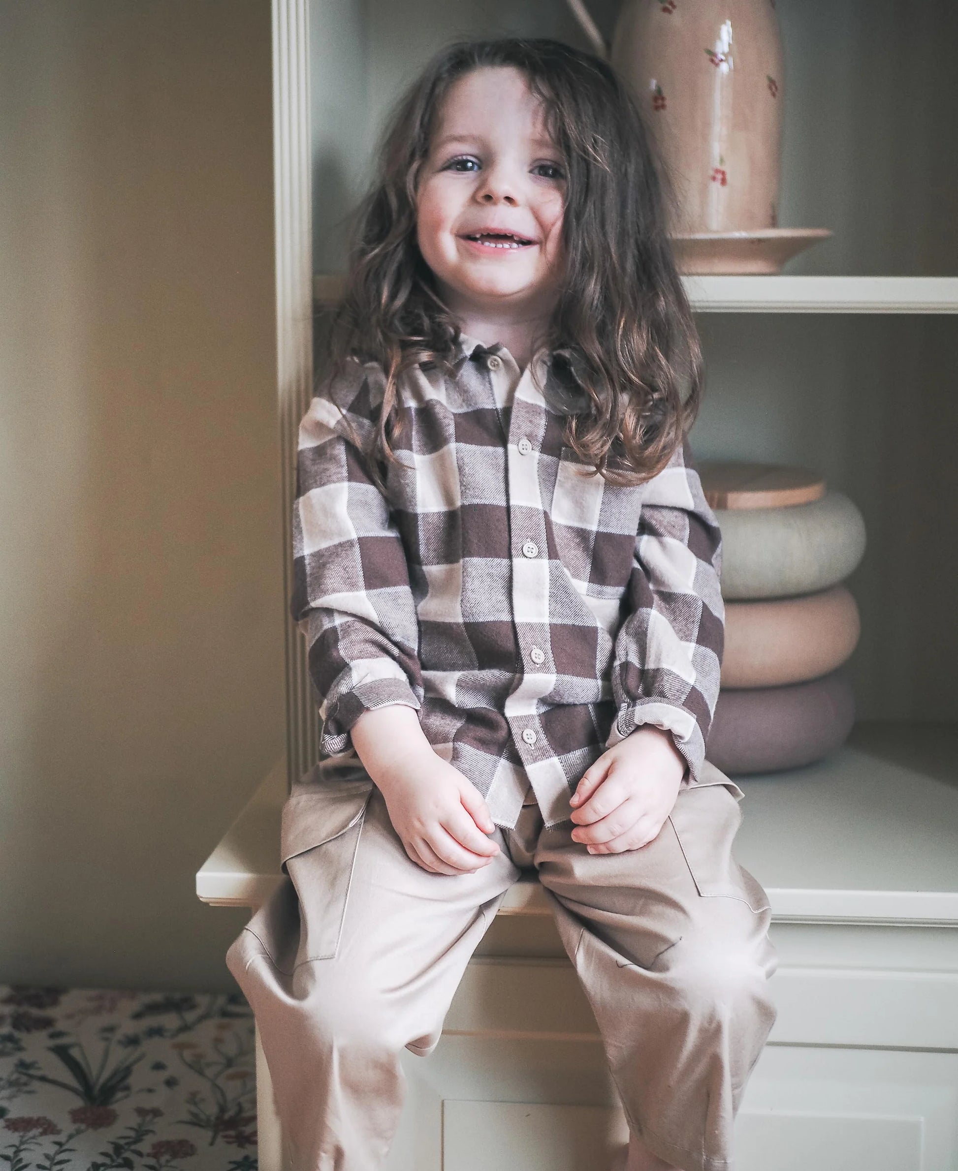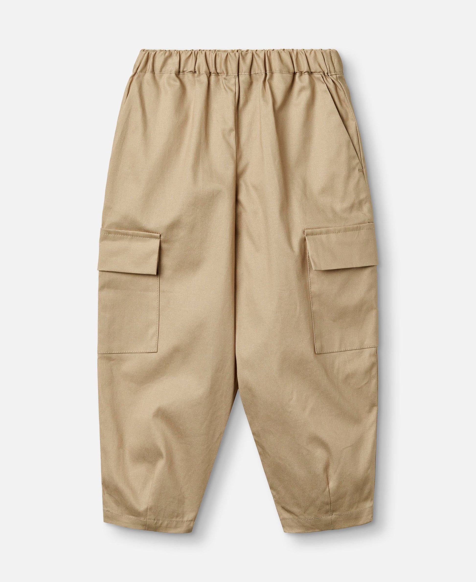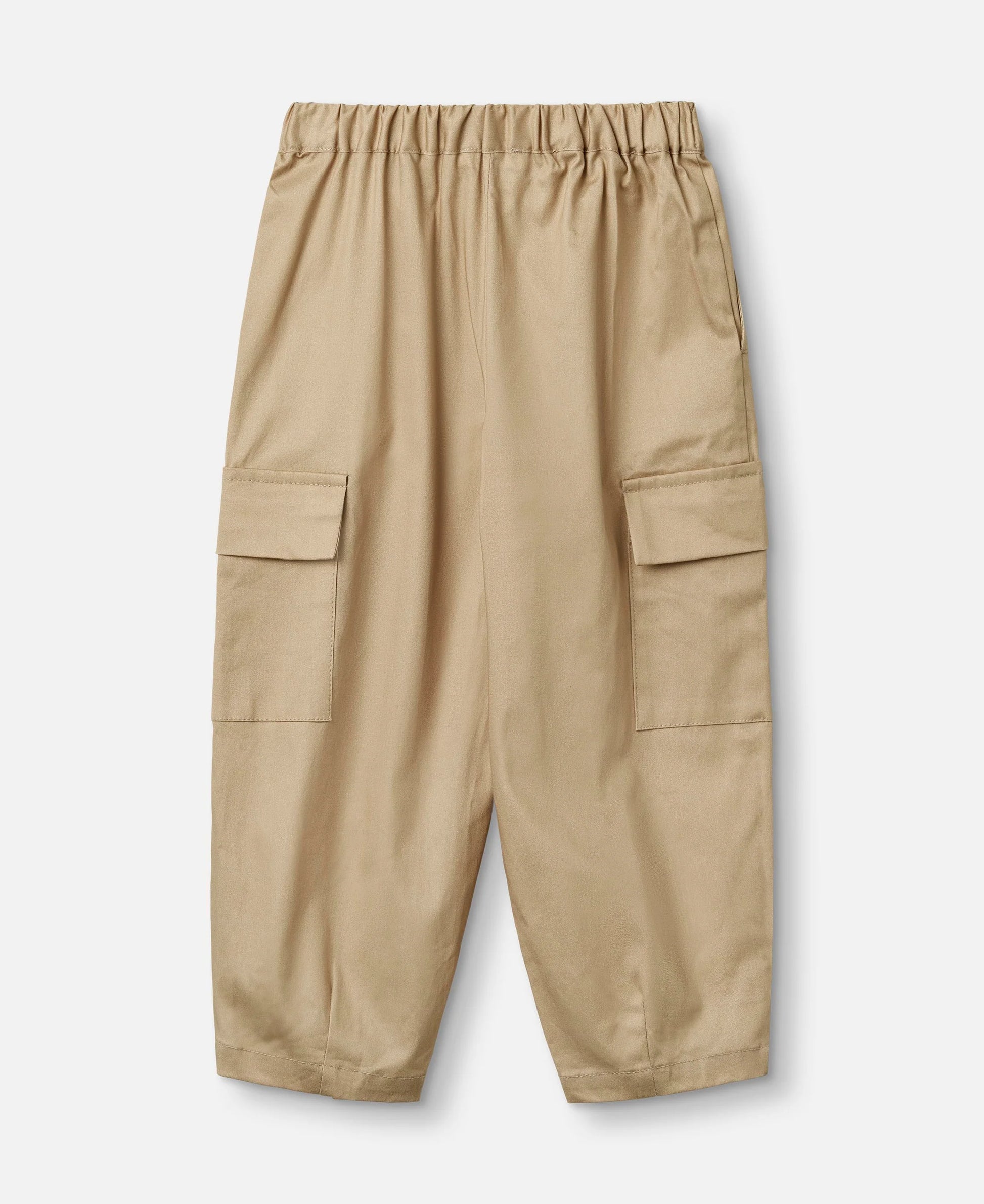 Bukser i blød bomuld med elastik i taljen. Bukserne har påsatte lommer ved knæene og har en løs pasform.