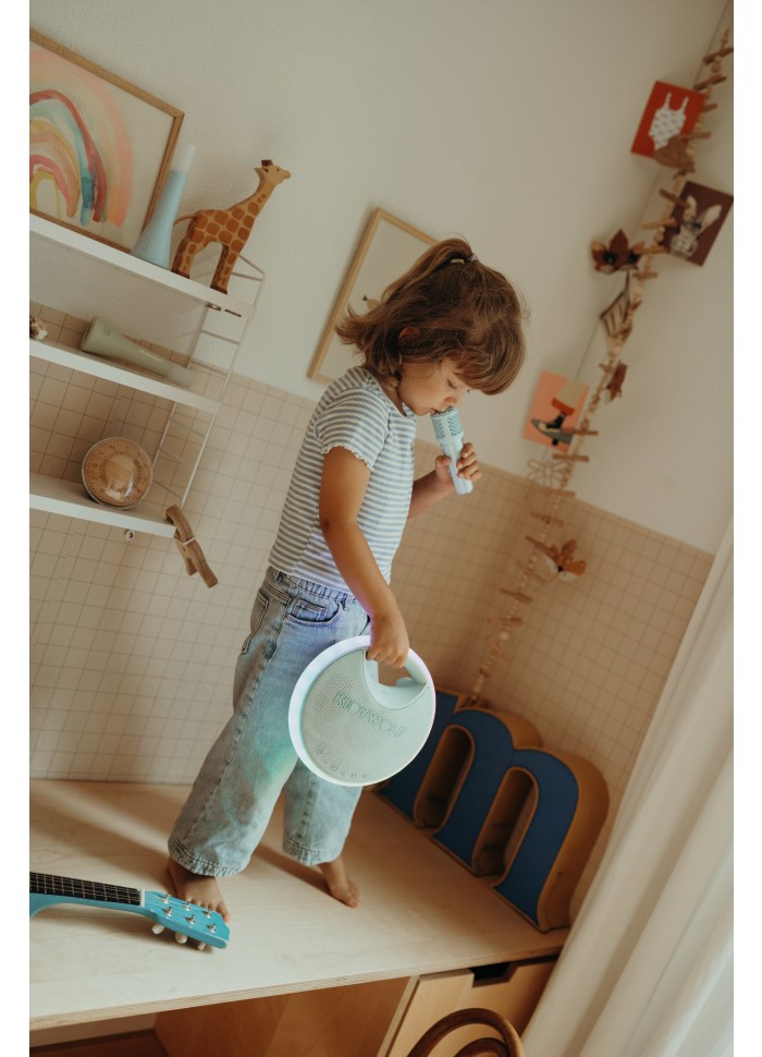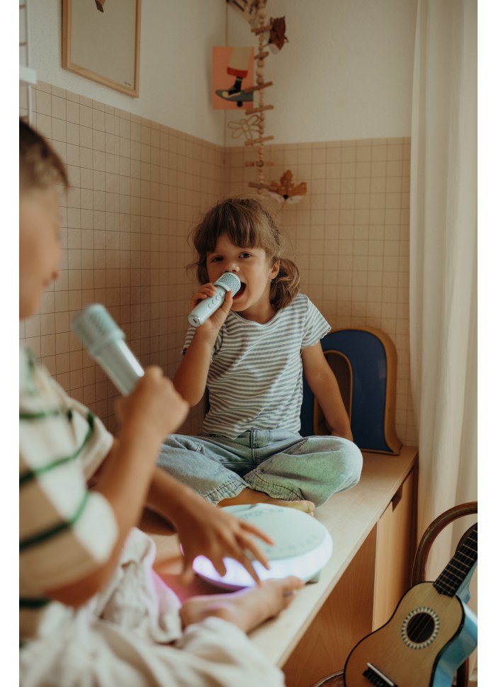 KIDYKARAOKE er designet til at være nem at bære og har et praktisk bærehåndtag og forlænget batterilevetid takket være det genopladelige USB-C-batteri. Denne kompakte og trådløse karaokehøjttaler er klar til at følge alle dine musikalske eventyr, uanset om det er derhjemme, udendørs eller på farten.