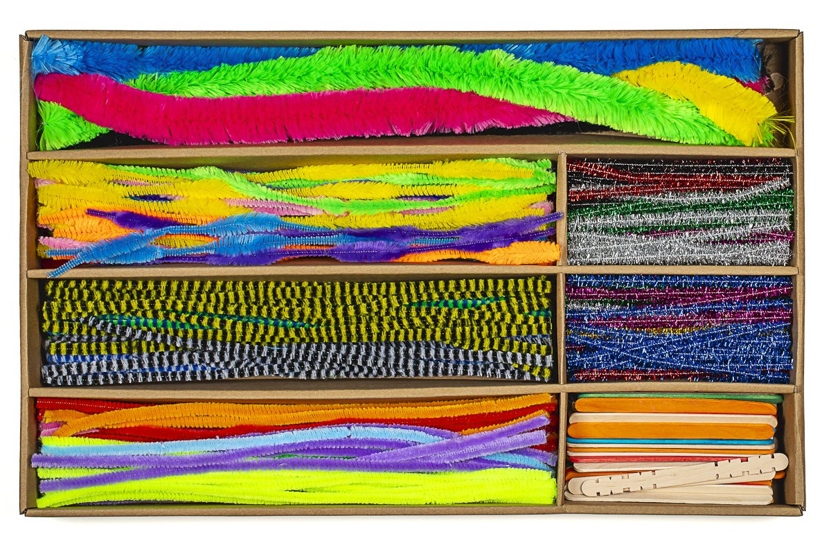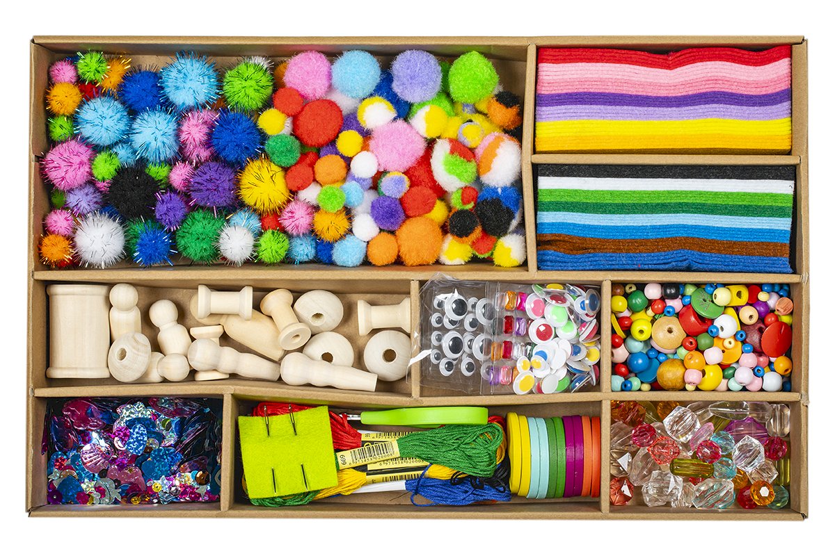 Lim, garn, nåle, filt i farver, rulleøjne til pålimning men også selvklæbende, pompons i flere versioner og farver, perler i flere nuancer og farver, ispinde, selvklæbende rhinsten, chenille i flere versioner, træfigurer og -perler, pailletter og farvede træskiver.