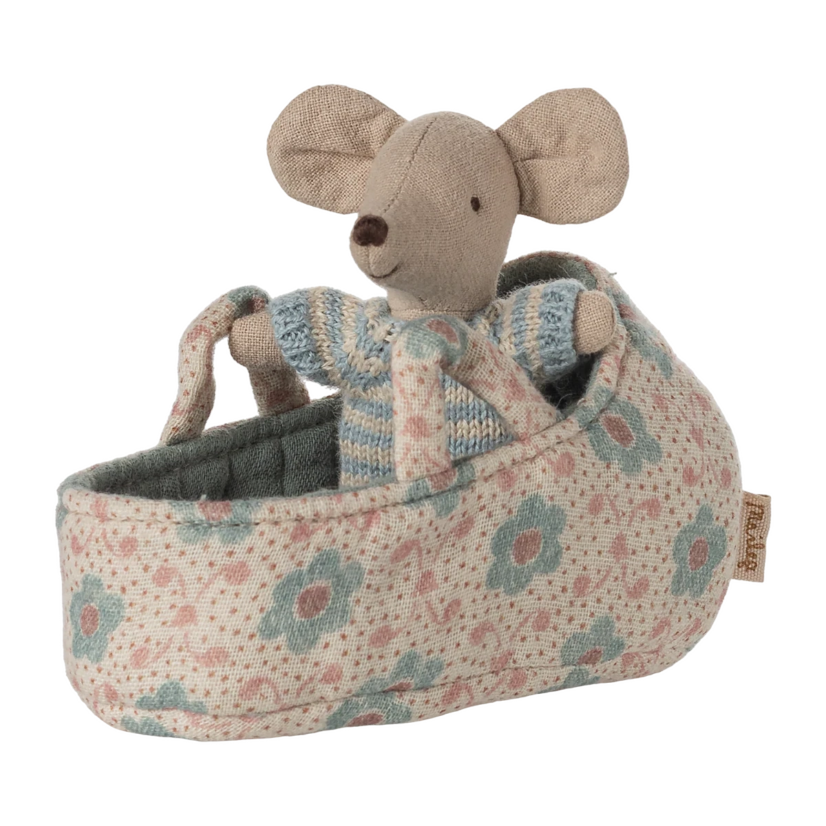 En lille musebaby i en blød og stribet strikdragt. Den sover i timevis i sin lille vatterede babylift.