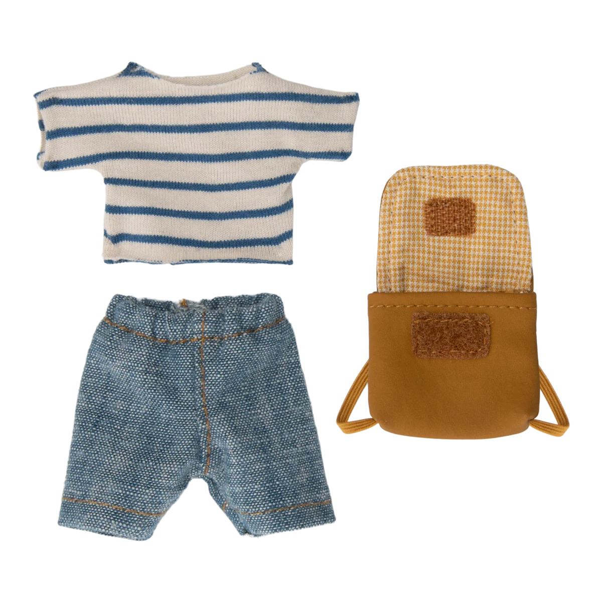 Et løst sæt tøj til mus i størrelse storebror/søster. Dette sæt indeholder et par shorts, en t-shirt og en rygsæk.
