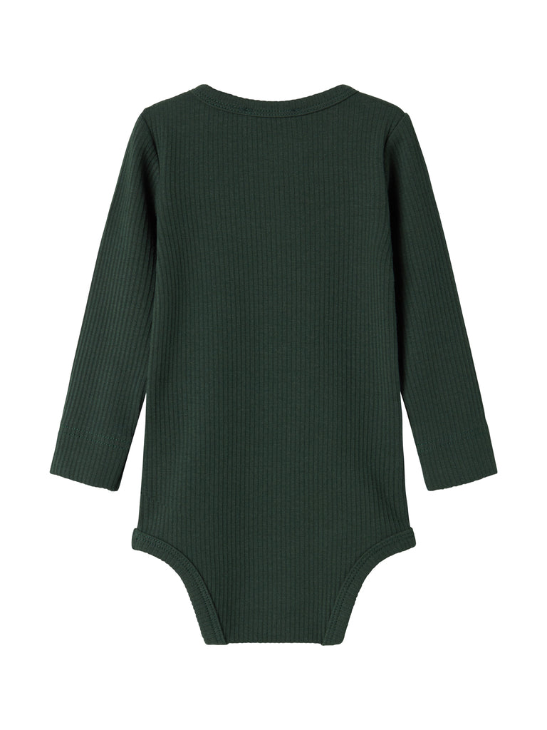 Langærmet baby modal bodystocking med stolpe knaplukning, der bliver lukket med trykknapper mellem benene for nem bleskiftning.