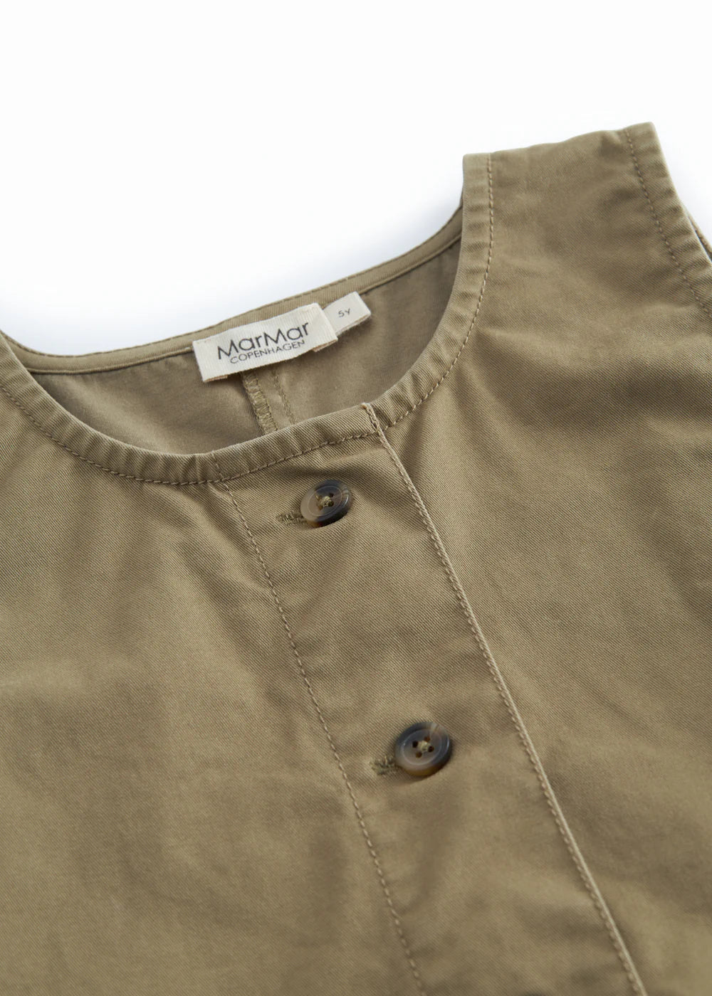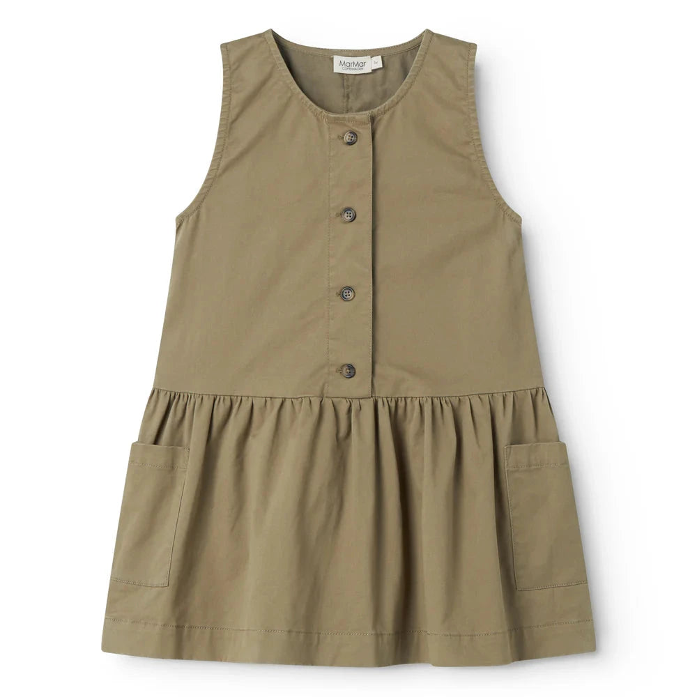 Ærmeløs chino kjole til børn med knapper foran og skørt der giver et let fald. Kjolen har to praktiske lommer i siderne. Kjolen har et løstsiddende fit og er behagelige at have på.