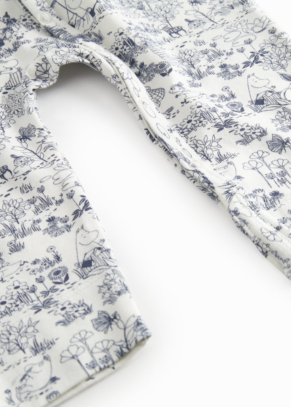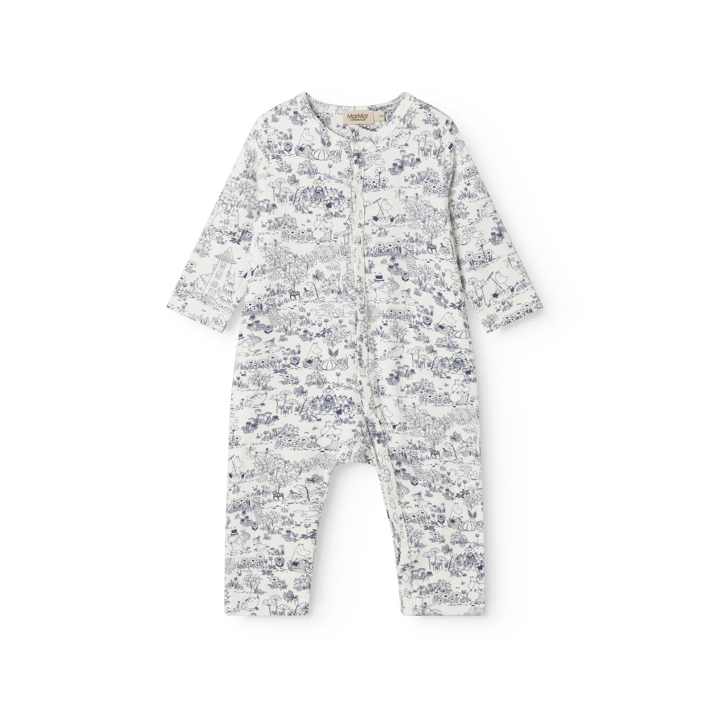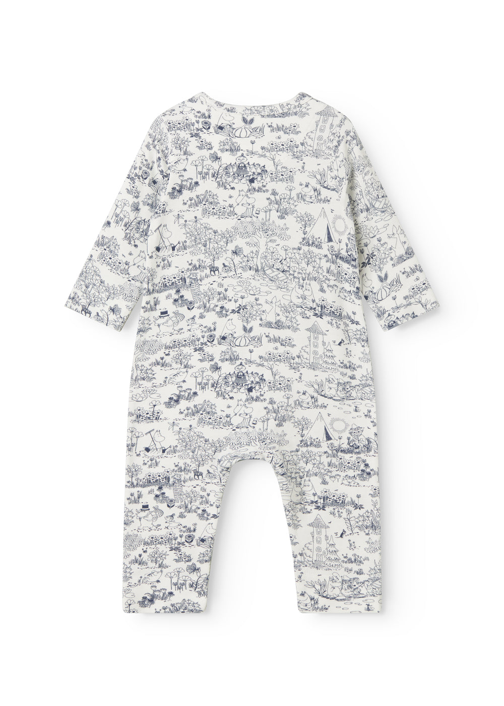 Enkel langærmet heldragt med sødt Moomin print, der kan knappes helt fra hals og ned langs begge ben med trykknapper for nem bleskiftning. Heldragten er både blød, holder form og farve og har elastan i sig som gør den strækbar og behagelig at have på.