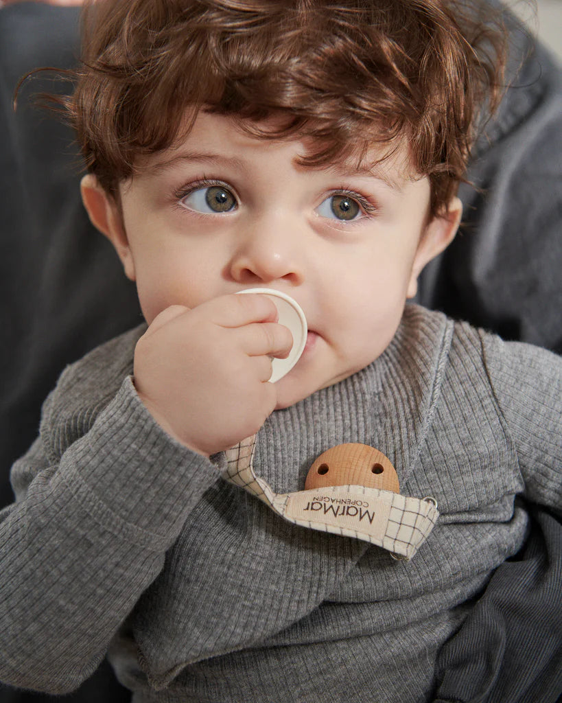 Fin suttesnor med træ clips og gummiring til at holde sutten. Længde på snor 19,5 cm