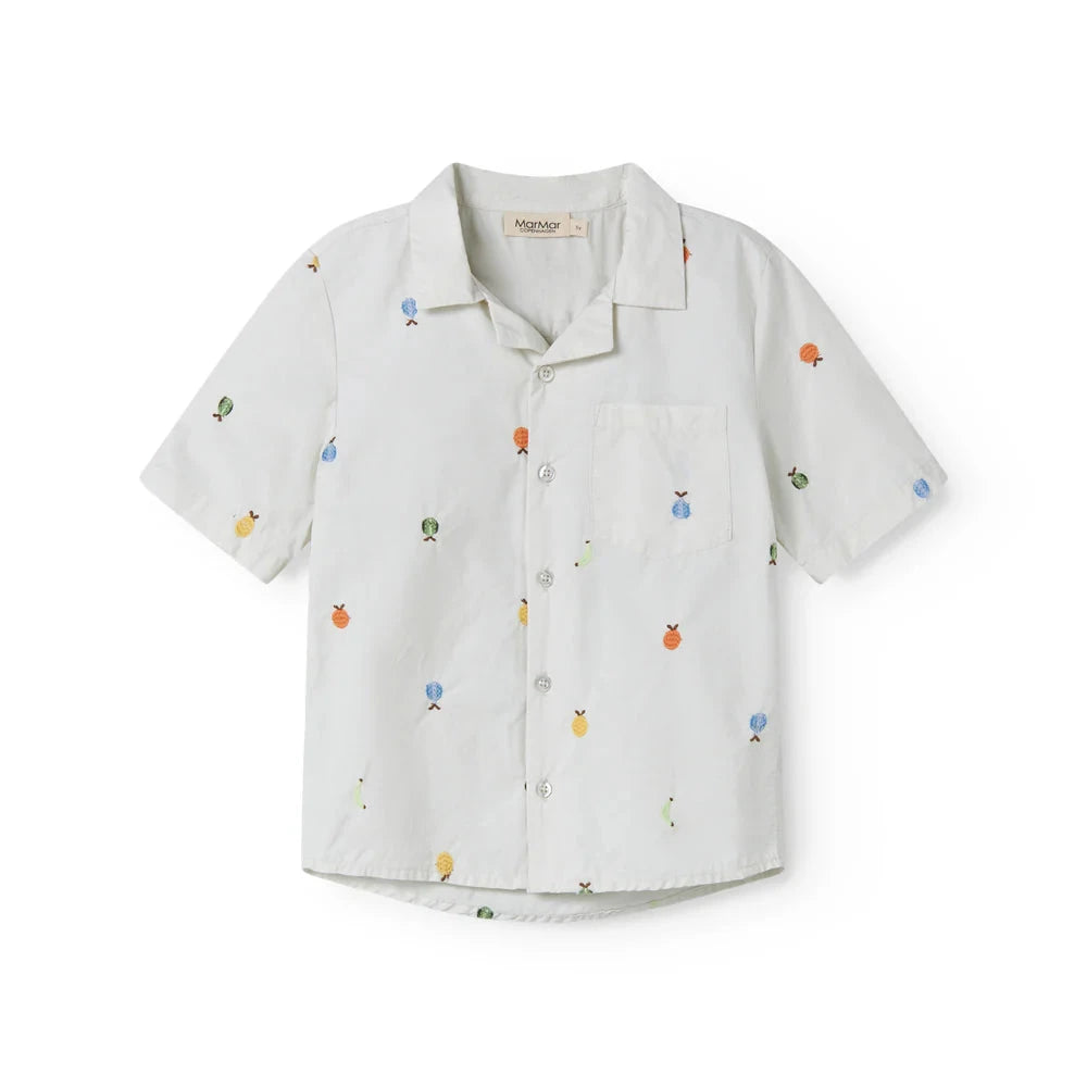 Kortærmet skjorte til børn med krave, knaplukning og en lille lomme foran. Skjorten har et fint frugt broderi og er i en let og crispy bomuldskvalitet, hvilket gør den behagelig at have på.