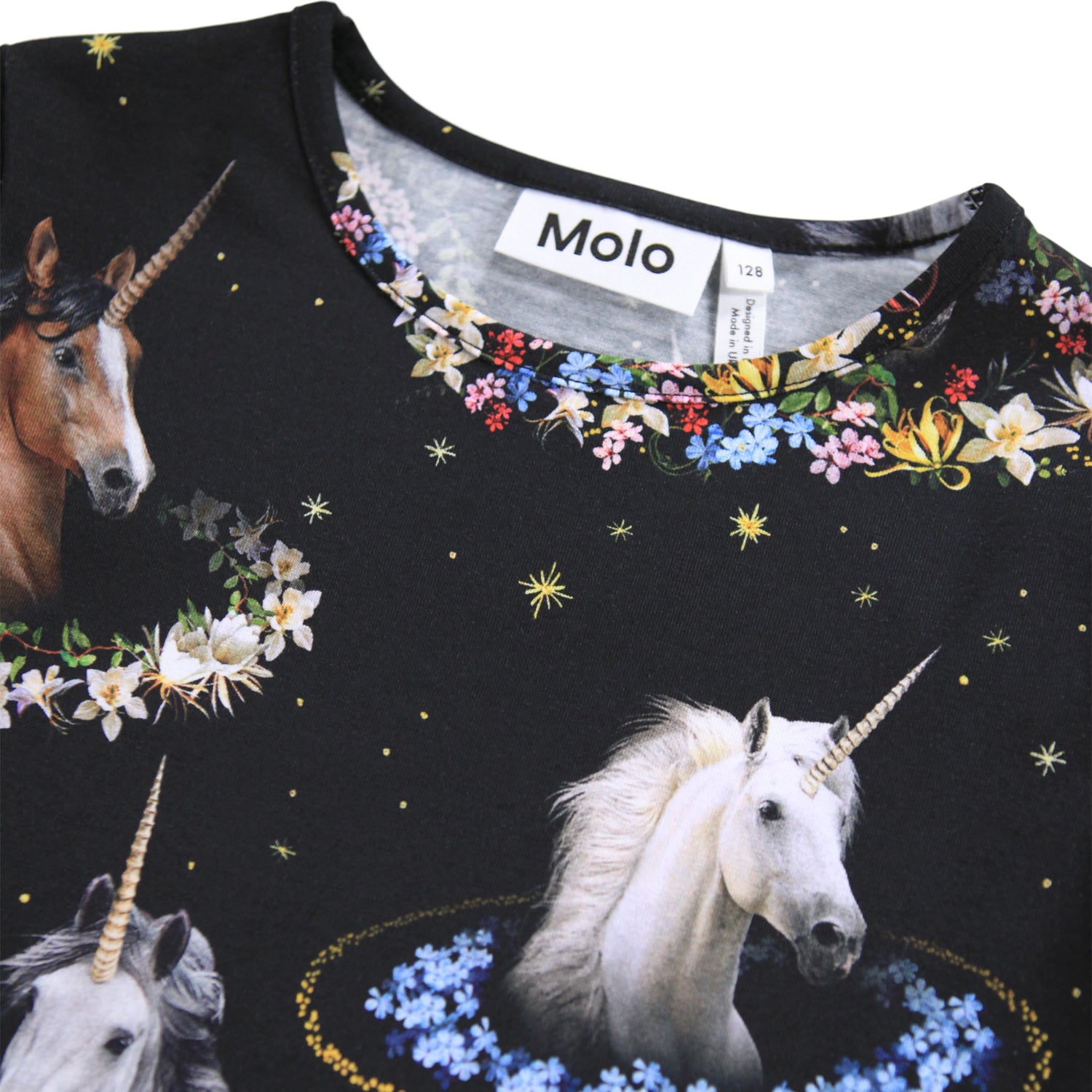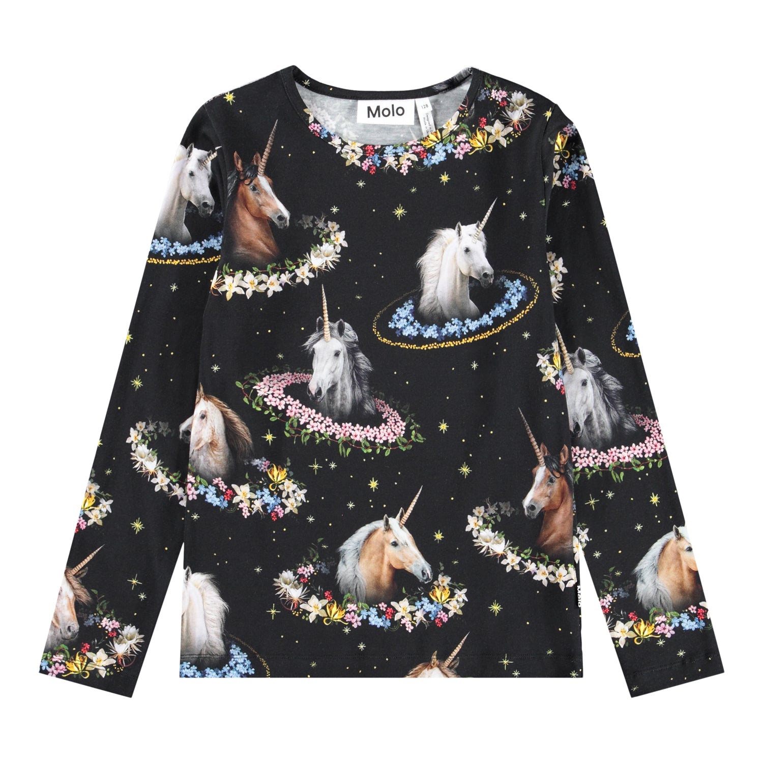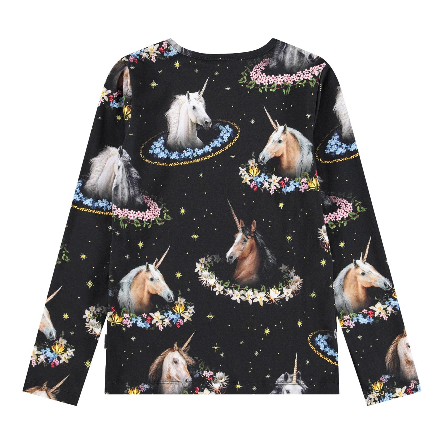Sort langærmet bluse i økologisk bomuld med rund hals og kantbåd. Blusen er tætsiddende og har et print af enhjørninger med farverige blomsterkranse.