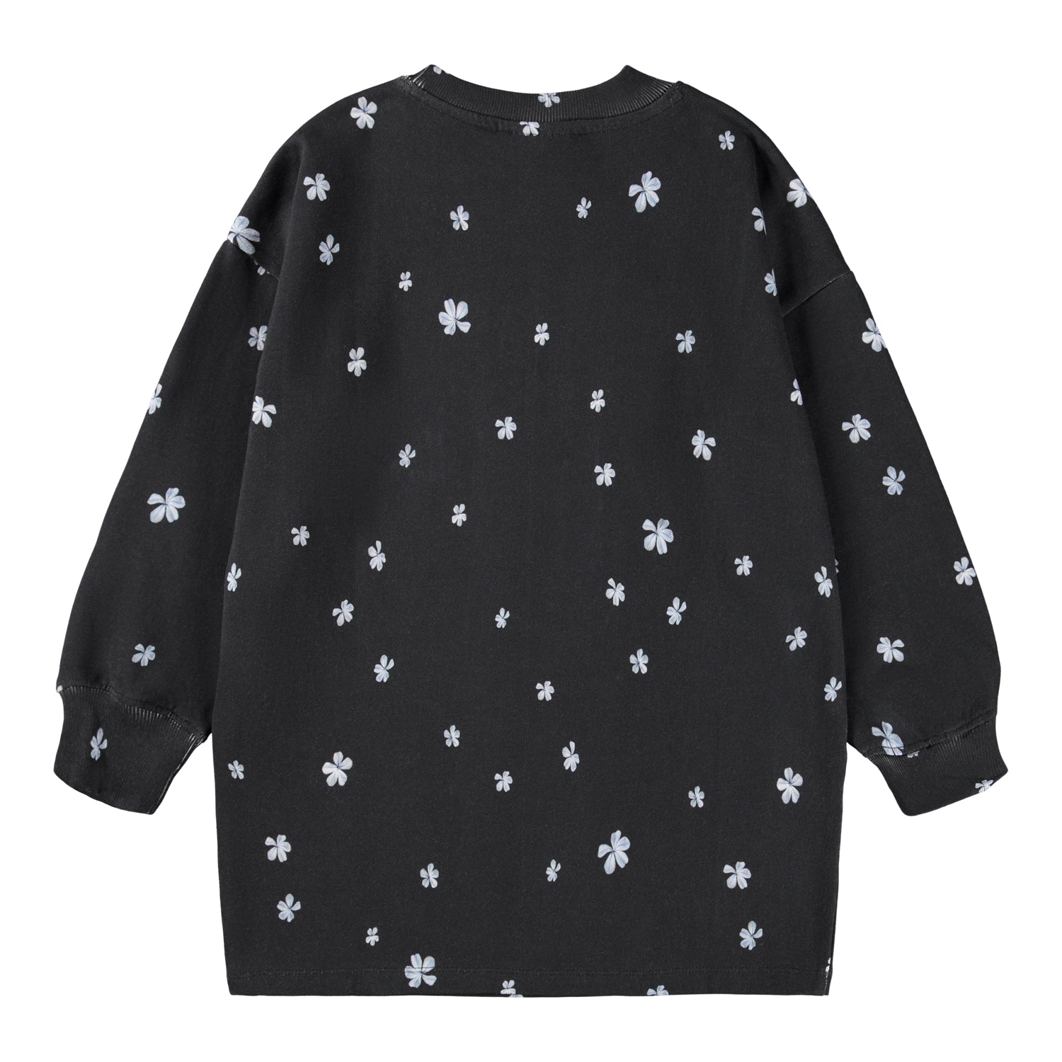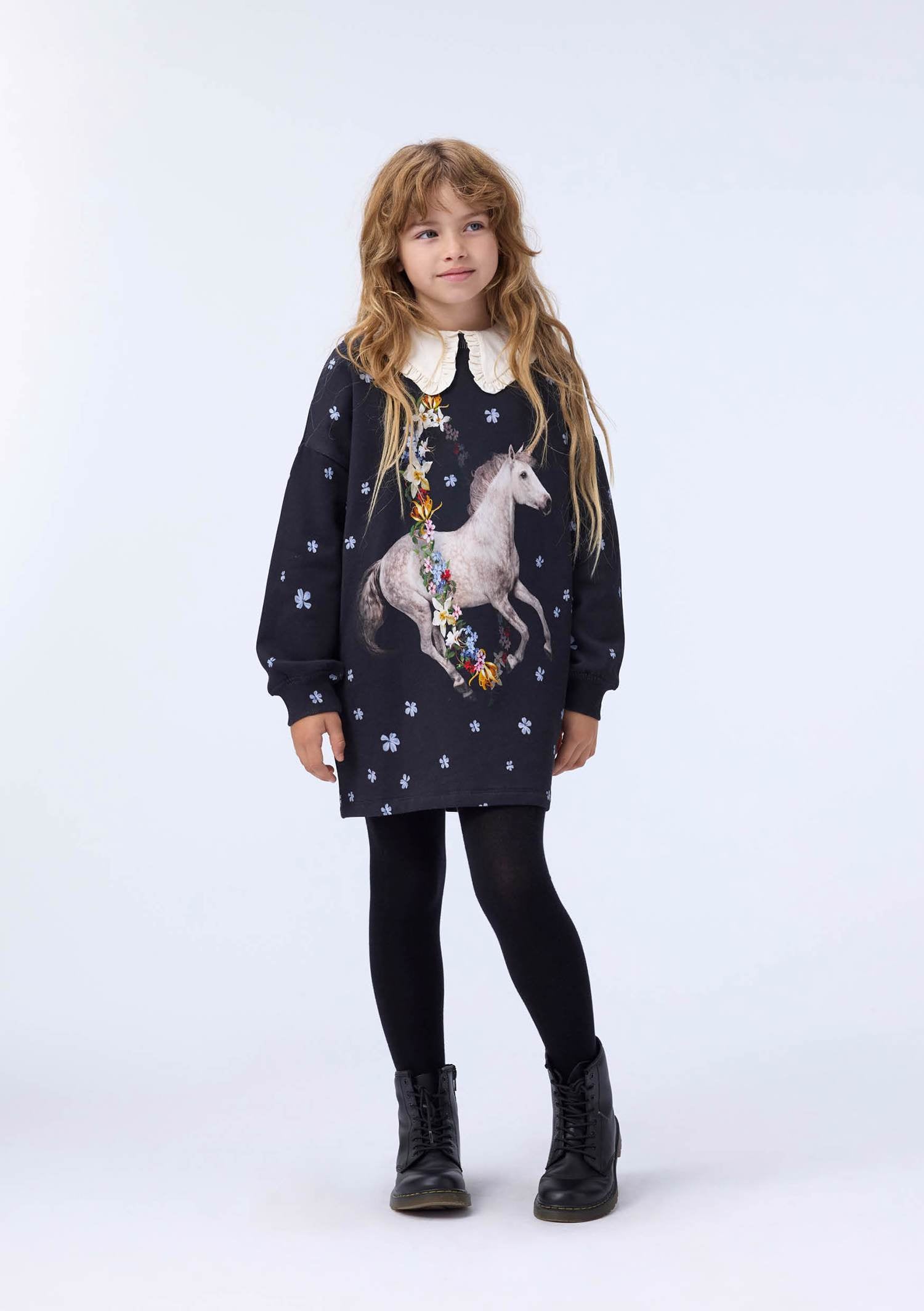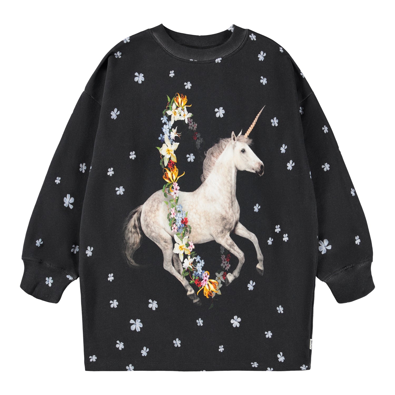 Sort langærmet bluse i blødt økologisk bomuld med ribkant i ærmer og hals. Blusen har en løs pasform og et print af guldstjerner, en hvid enhjørning med en farverig en farverig blomsterkrans om halsen.