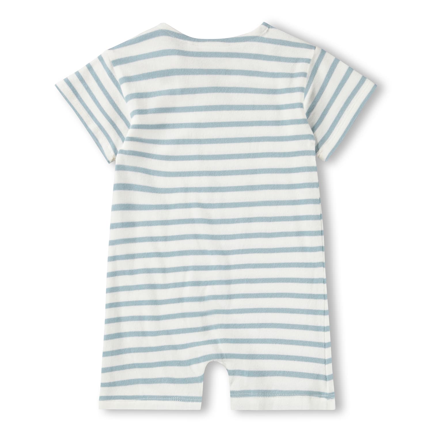 Stribet sommerdragti lyseblå og hvid med sød broderet smiley til de mindste. Dragten er i økologisk bomuld og har knaplukning på skulderen samt trykknapper i benene, der gør den nem at tage på.