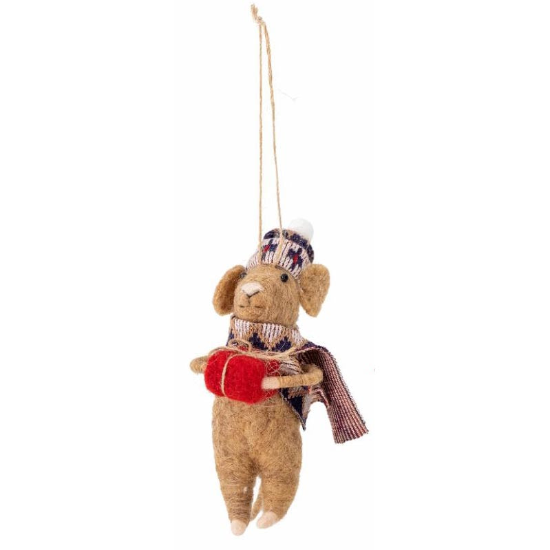 Sød julemus med gave, der spreder glæde, uanset hvor den placeres, om det er på grene, dørhåndtag eller måske på julegaver.
