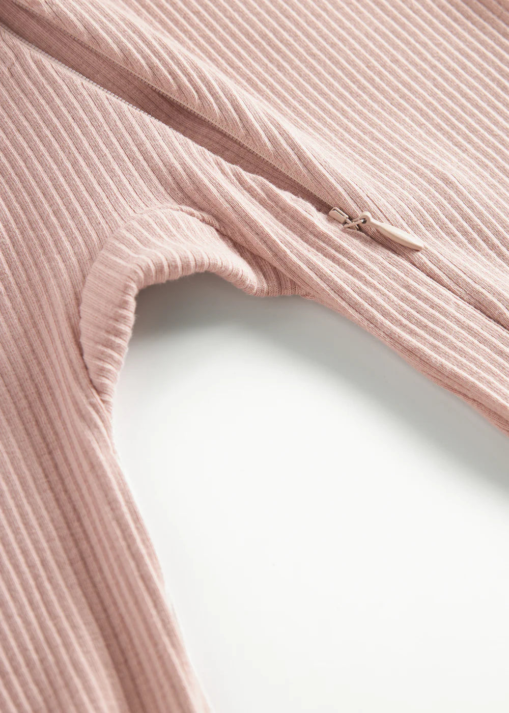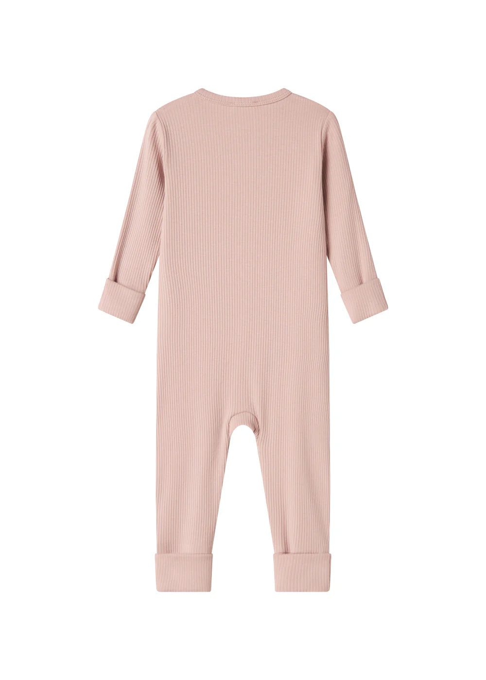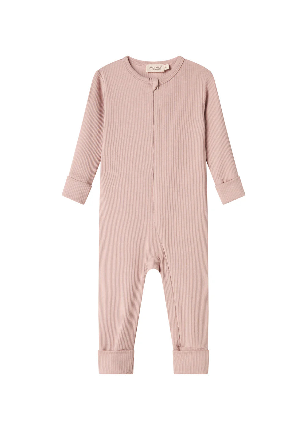 Enkel langærmet heldragt der kan lynes helt fra hals og ned langs det ene ben med lynlås for nem bleskiftning. Heldragten har ombuk ved både ærmer og ben, som kan justeres i takt med barnets vækst. Heldragten har ydermere foldbar vante/strømpe funktion fra str. 2-4M. Heldragten er ribstrikket, blød, strækbar og behagelig at have på.