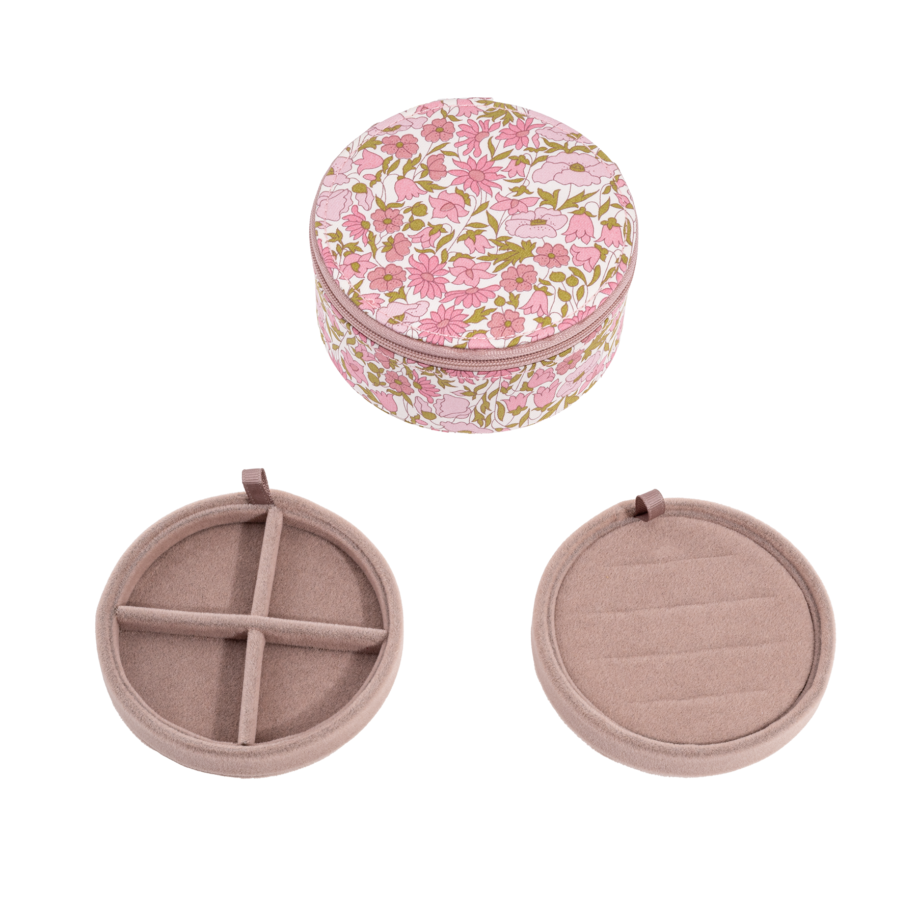 Lækkert rundt smykkeskrin beklædt med smukt Poppy and Daisy Liberty stof. En feminin og sød smykkeboks, som også er særdeles velegnet til at have med i kufferten. Smykkeæsken består af et stor rum med to bakker til sortering af dine smykker. Indersiden af smykkeskrinet er polstret med velour, og selve smykkeskrinet lukkes med en smart lynlås, der gør det nemt at have med på farten.