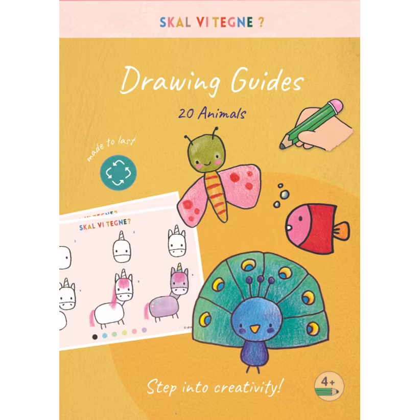 Denne tegneguides-pakke indeholder 20 tegneguides. Hvert motiv er opdelt i enkle trin, så børn nemt kan følge med og