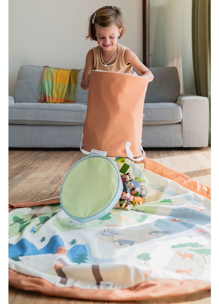 "Soo by play&go" er der, hvor sjov begynder, og rodet slutter. En rummelig legemåtte til timevis af fantasi. Når legen er slut, skal du bare trække i snoren, og alt kan opbevares pænt i en stilfuld kurv, der passer smukt ind i ethvert rum.