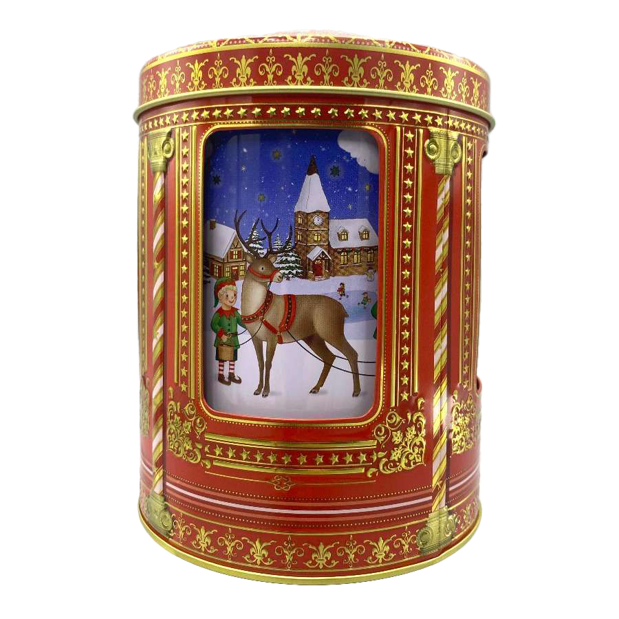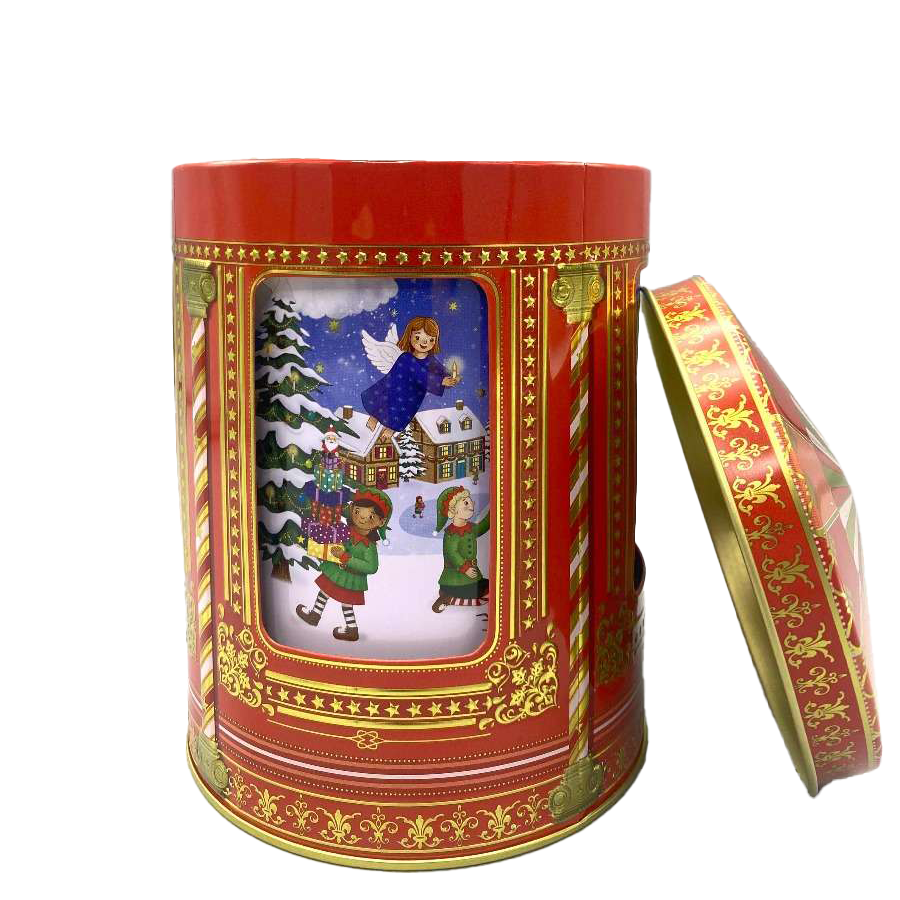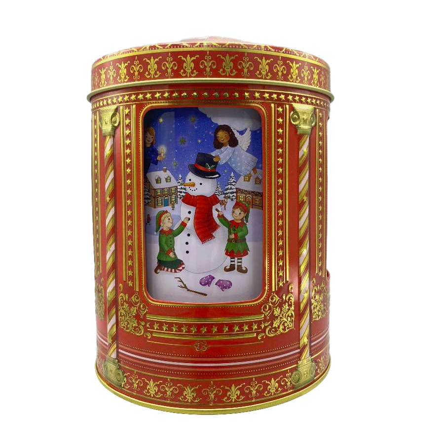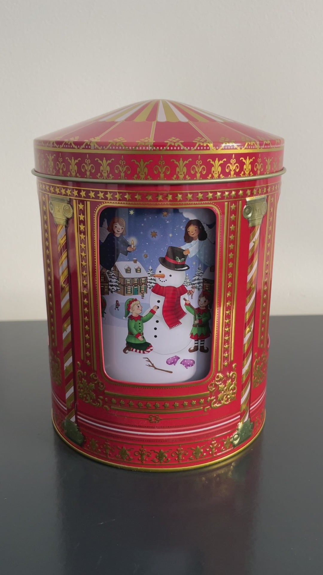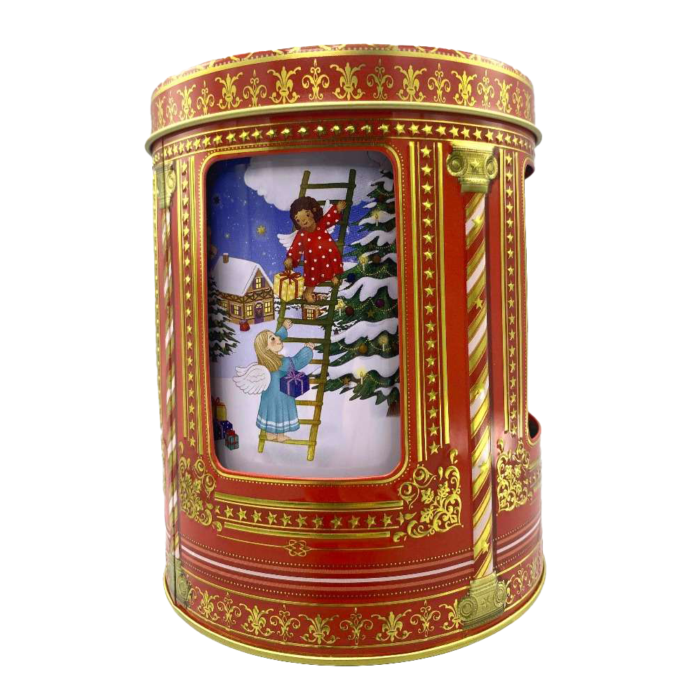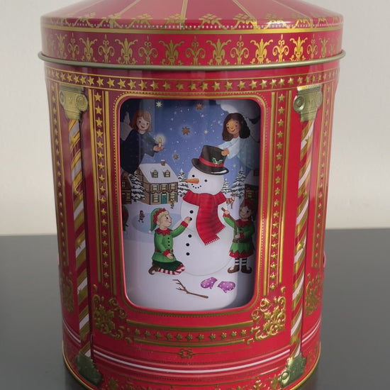2024 jule-kagedåsen udformet som en karrusel med julemotiver af Snemand, Rensduret Rudolf, Nisser, børn og engle der leger i sneen og pynter op til jul.