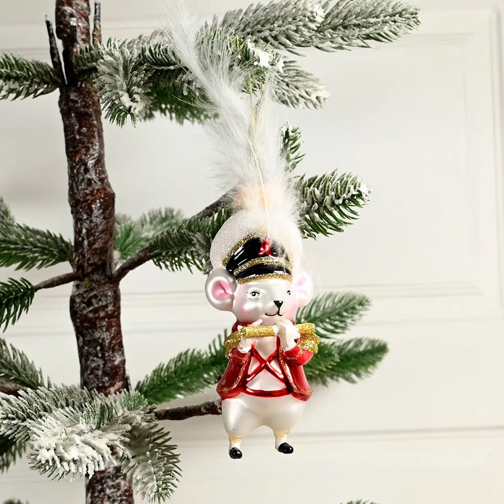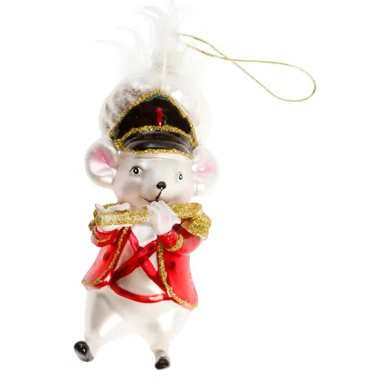 Sød glimmer julemus der spiller fløjte som figur-julekugle.