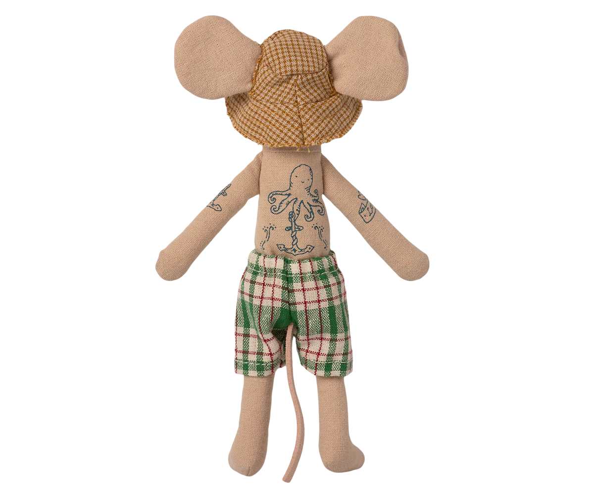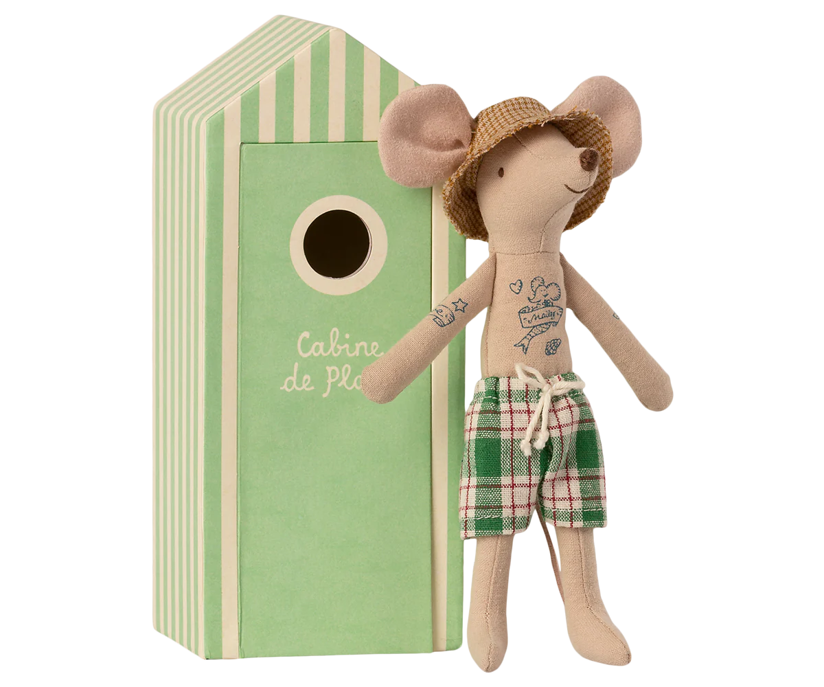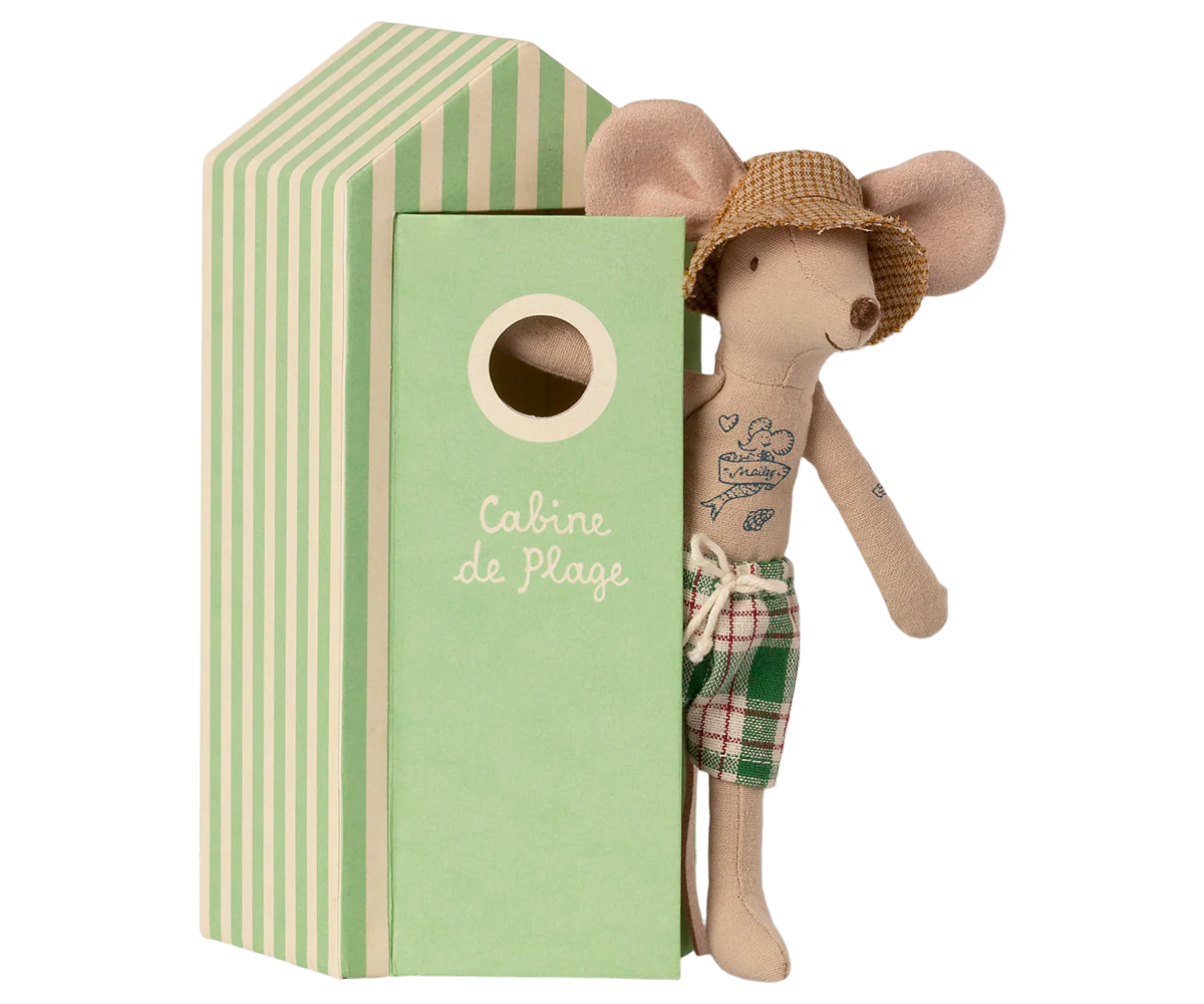 Ferie tid. Denne mus er klar til en dag på stranden med alt det nødvendige tilbehør og en smuk stribet strandhytte.