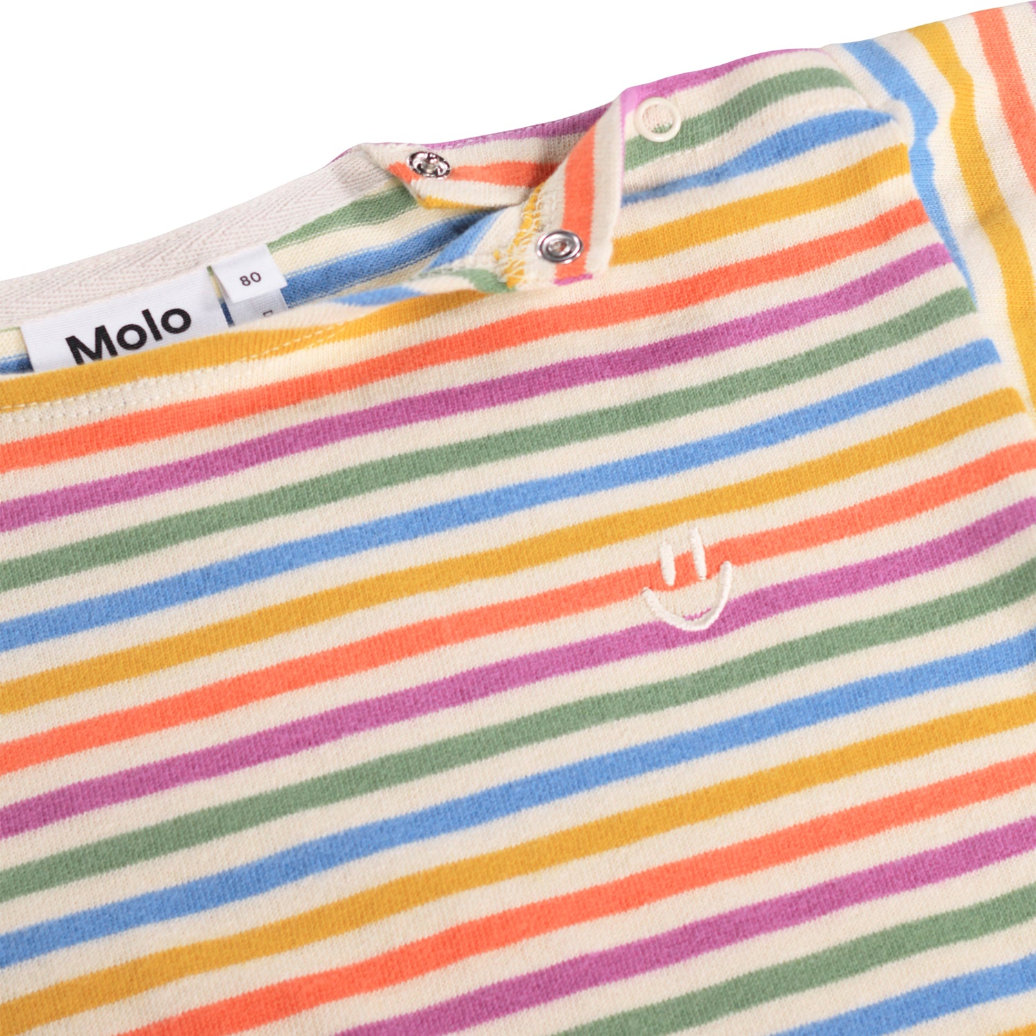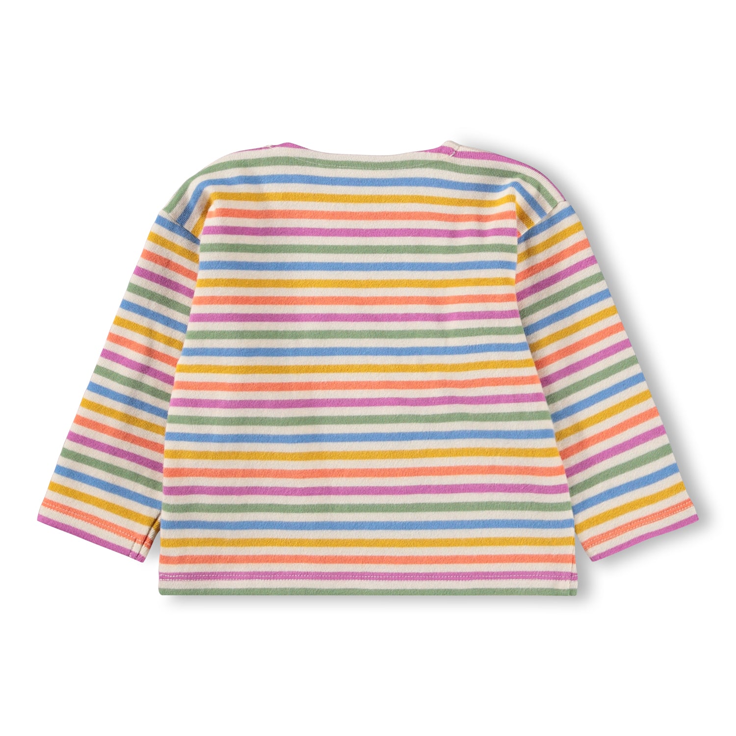 Langærmet bluse i økologisk bomuldsjersey til de mindste. Blusen har striber i regnbuens flotte farver. Blusen har god bevægelighed, lange ærmer og ribkant på ærmerne. Den har også to trykknapper på venstre skulder, hvilket gør den nem at komme i.